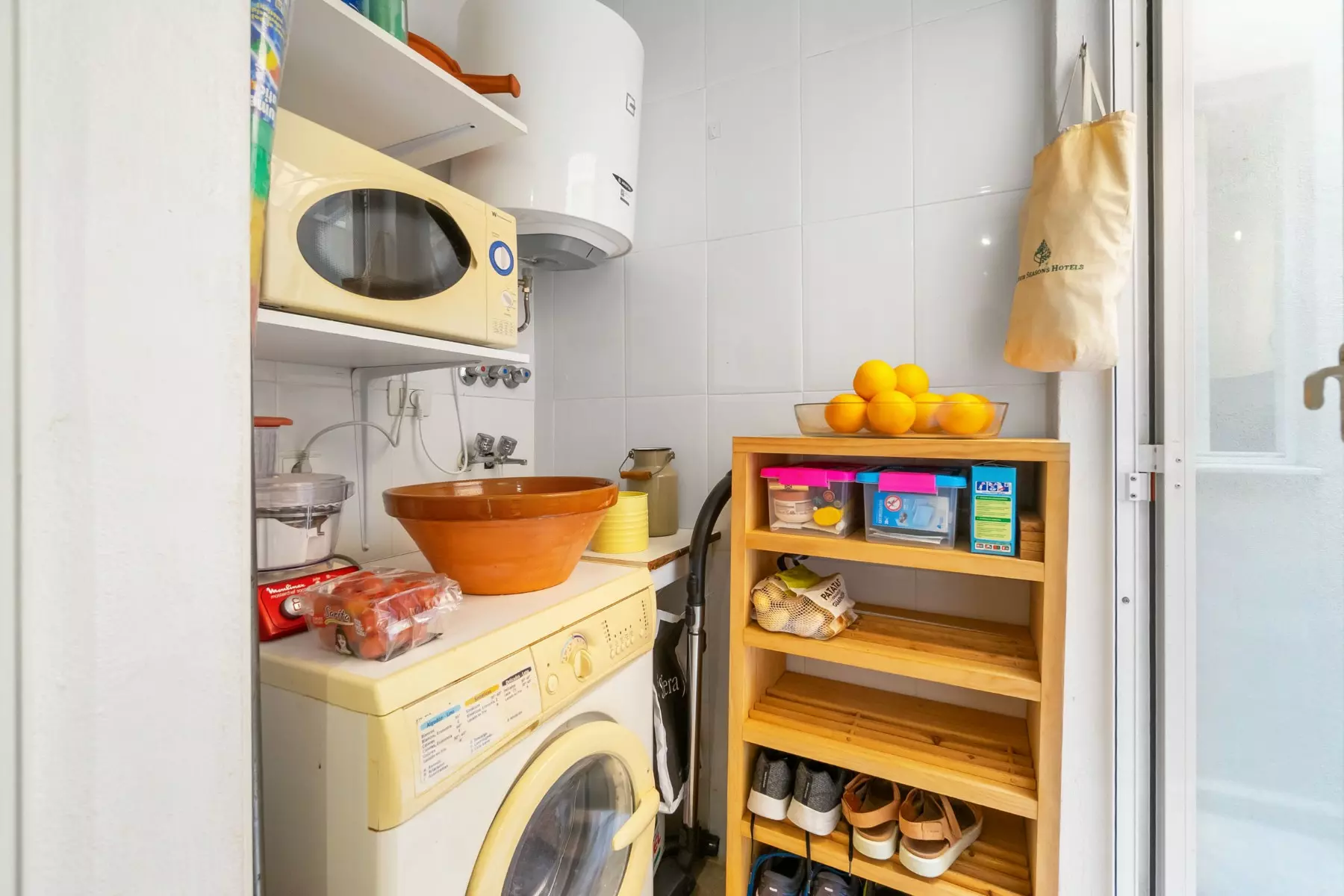 A practical kitchen is included, featuring an adjoining storage and laundry room. This arrangement adds convenience for managing household tasks efficiently.