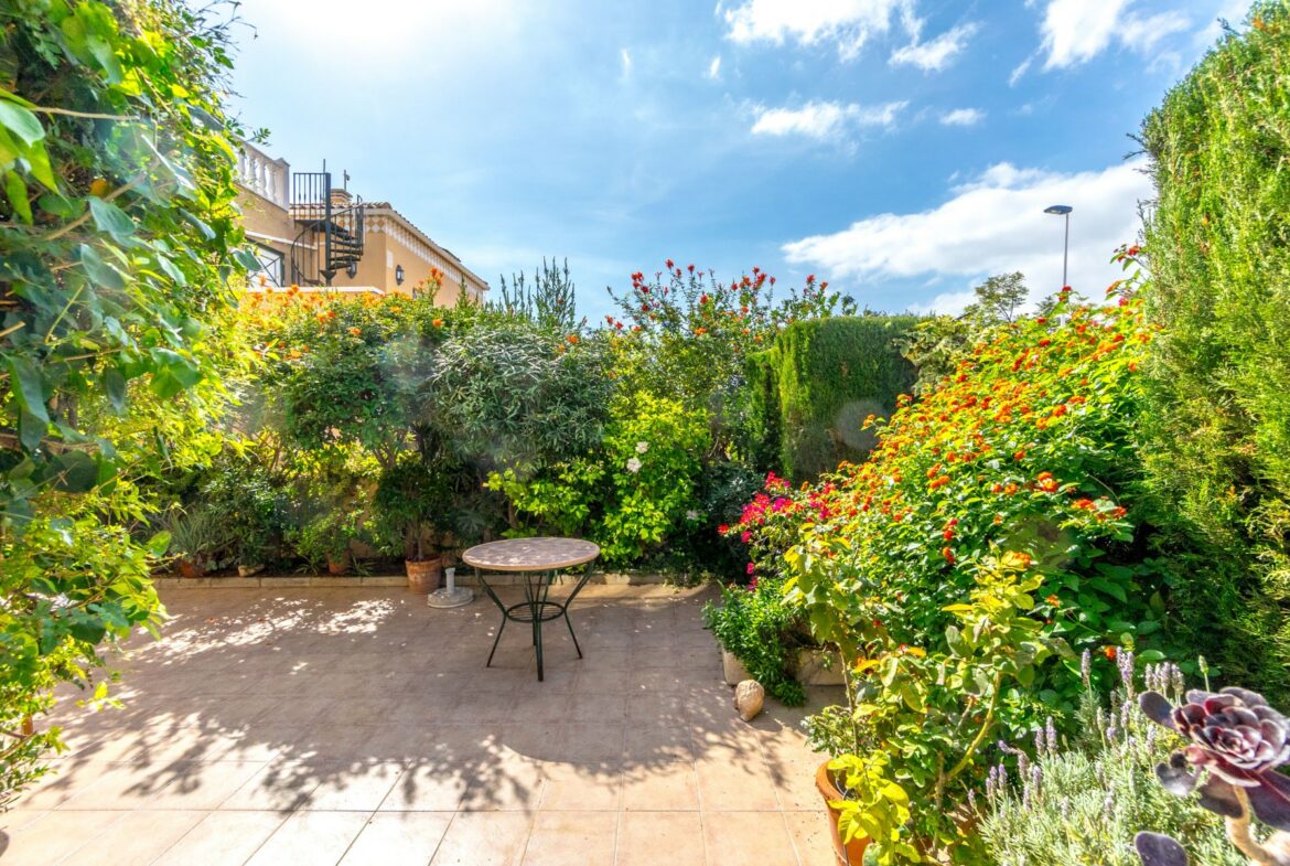 The living room serves as a central area with direct access to the terrace and garden, allowing for a seamless indoor-outdoor living experience. Both bedrooms provide adequate space, with a third room designated as a functional bathroom.