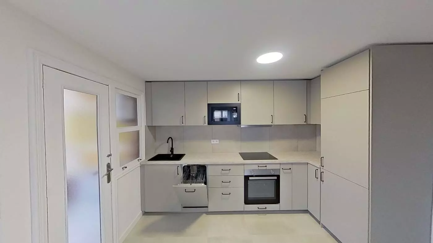 The large living room serves as a central hub for daily activities. It comes with an integrated modern kitchen, designed for efficiency and functionality. A door from the kitchen leads directly to a terrace, where you can enjoy fresh air and outdoor moments.