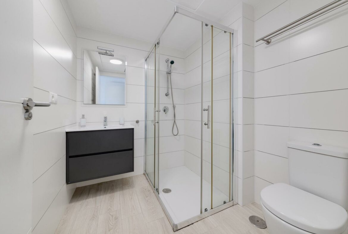 Situated on the first floor of a building equipped with an elevator, this property is designed for convenient access. Inside, you’ll find an entrance hall that leads to two bedrooms, both featuring built-in wardrobes for ample storage. The layout includes two bathrooms, each fitted with a walk-in shower, enhancing accessibility.
