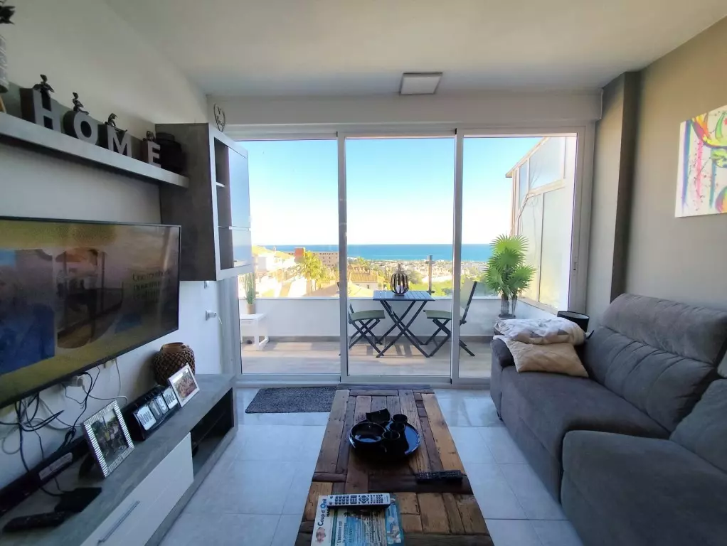 - A bright living room with direct access to a terrace showcasing panoramic sea views