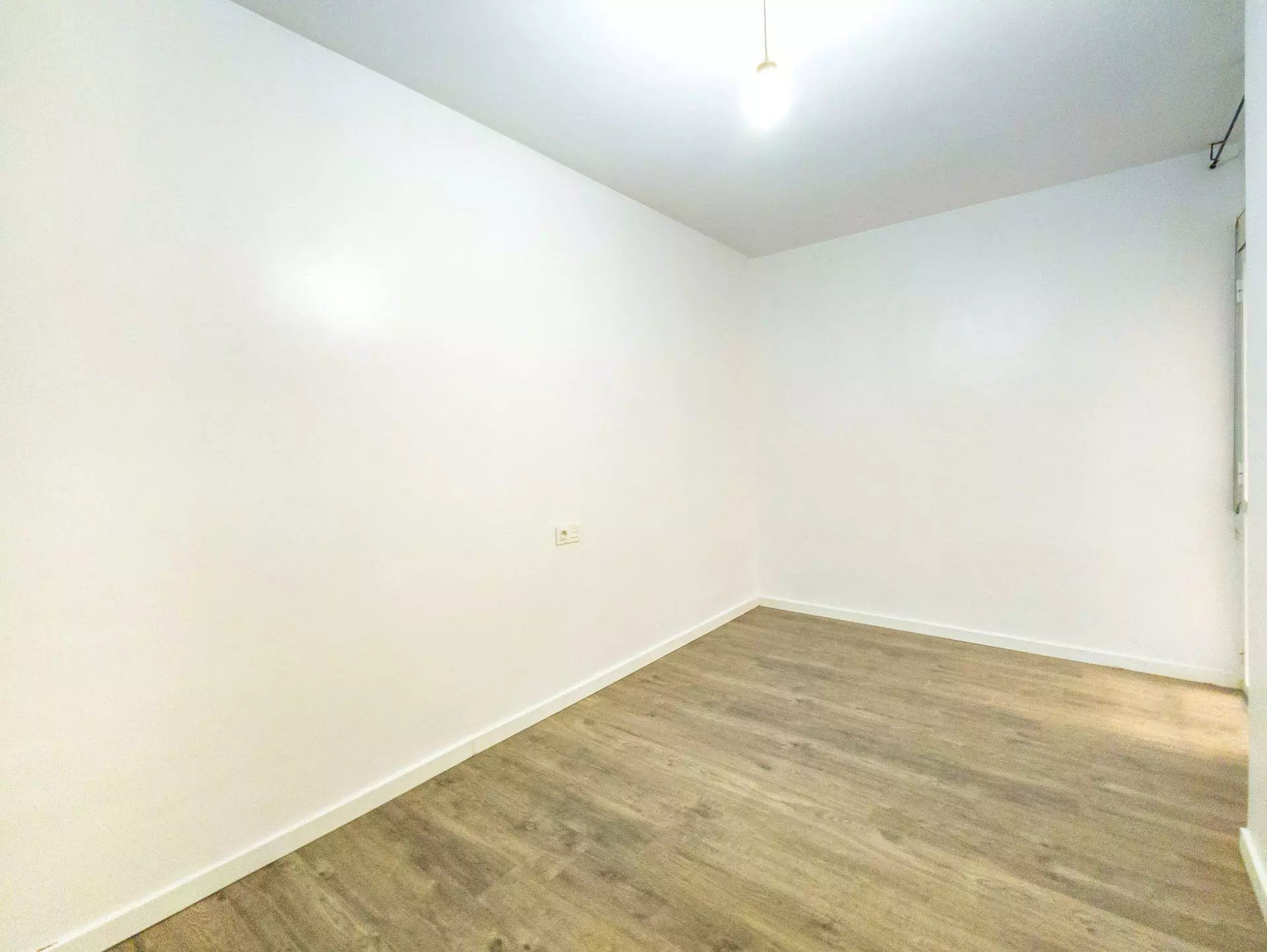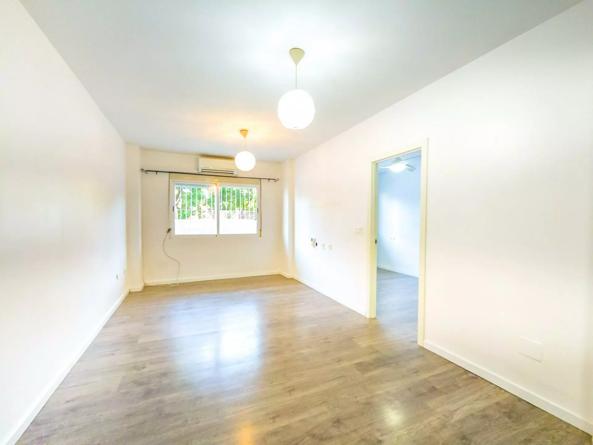 This renovated apartment features a living room that is both spacious and bright. The design includes an open kitchen that is fully equipped, making it functional for daily living or entertaining guests. Natural light fills the space, creating an inviting atmosphere.