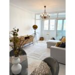 This renovated apartment features a living room that is both spacious and bright. The design includes an open kitchen that is fully equipped, making it functional for daily living or entertaining guests. Natural light fills the space, creating an inviting atmosphere.