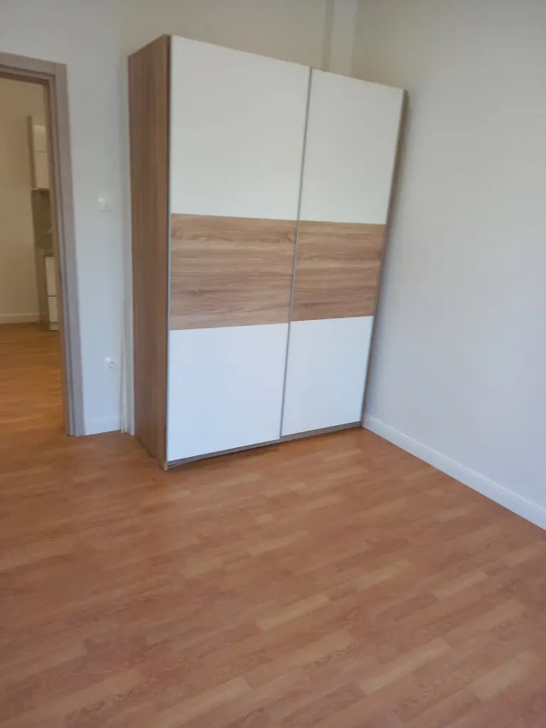 The apartment consists of 2 bedrooms, a living room combined with a kitchen, and one shower WC. The double-frontage layout allows for natural light to enter the living spaces, enhancing the overall atmosphere within the unit. This design also enables optimal views, as the windows provide a perspective of the city.