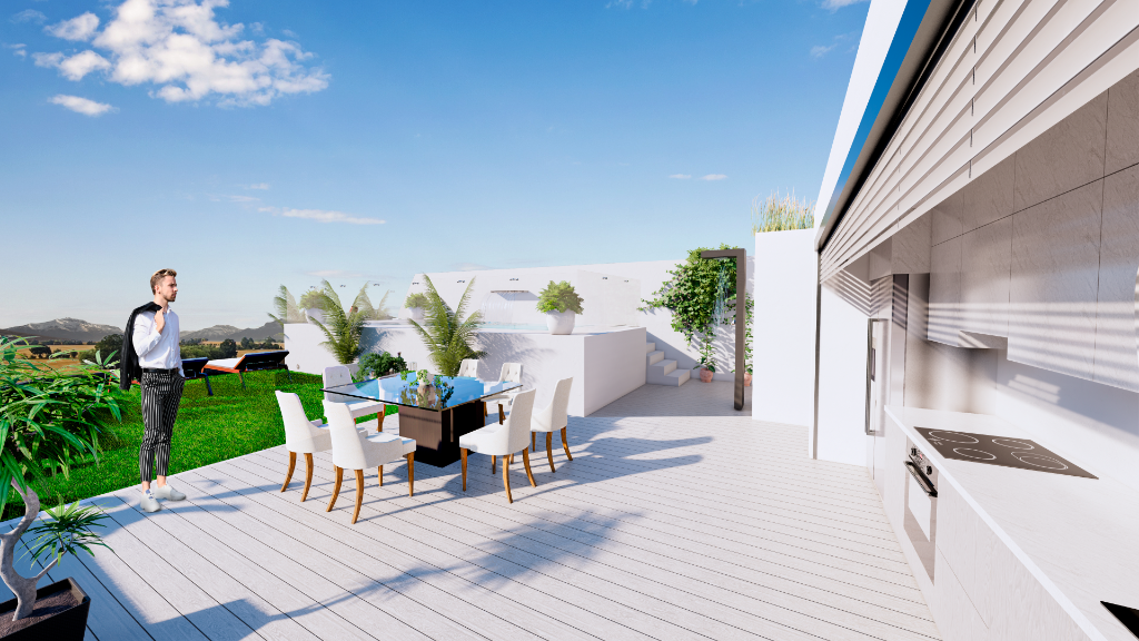 Each apartment includes three bedrooms and either two or three bathrooms, providing flexibility depending on your needs. The layout features a living room and kitchen designed for functionality. Additionally, every unit comes with a terrace and a private solarium, offering outdoor spaces for relaxation or entertainment.