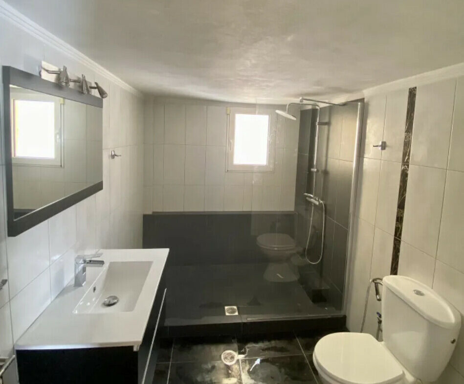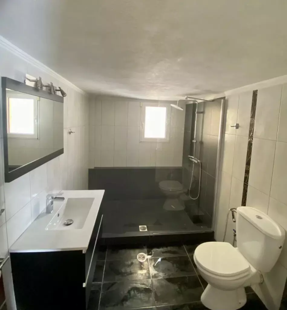 The living room seamlessly integrates with the kitchen, offering a combined area for daily activities. This layout allows for flexibility in how the space can be used, whether for entertaining or relaxing. The apartment includes one shower WC and an additional WC, ensuring convenience for both residents and visitors.