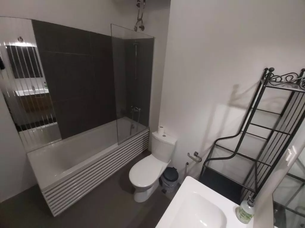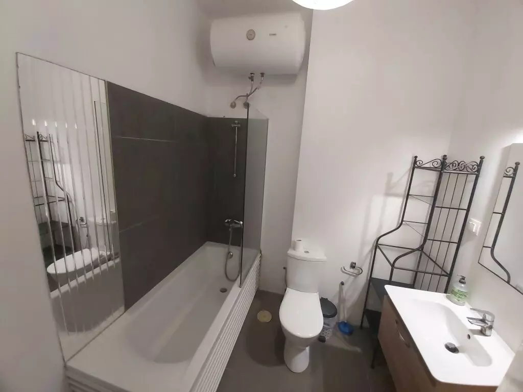 This flat is equipped with air conditioning, which can add to a comfortable environment during warmer months. Additionally, there are awnings installed, contributing to shade and protection from direct sunlight. The heating system ensures that the space is usable during the cooler seasons, adding to the overall utility of the apartment.