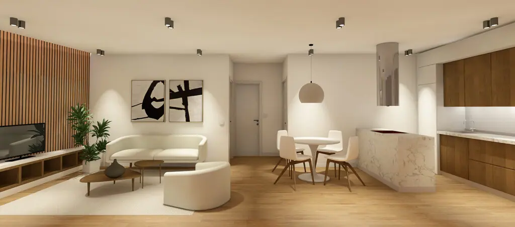 This apartment consists of two bedrooms, which can cater to various living arrangements. The living room is integrated with the kitchen area, promoting an open-plan feel. The design includes one shower WC, ensuring that the unit meets basic functional needs. The layout is organized to maximize the usability of the living space.