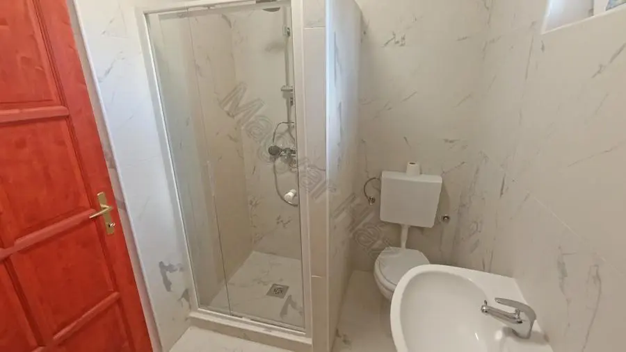 Entering the house via the terrace leads you to a hallway. On your left, there is a bedroom, while the bathroom is conveniently located on the right. Continuing through the hallway, you arrive at the living room that connects to the kitchen area. Note that the kitchen furniture needs to be updated. From this area, you can also access another living space that serves as a second bedroom.
