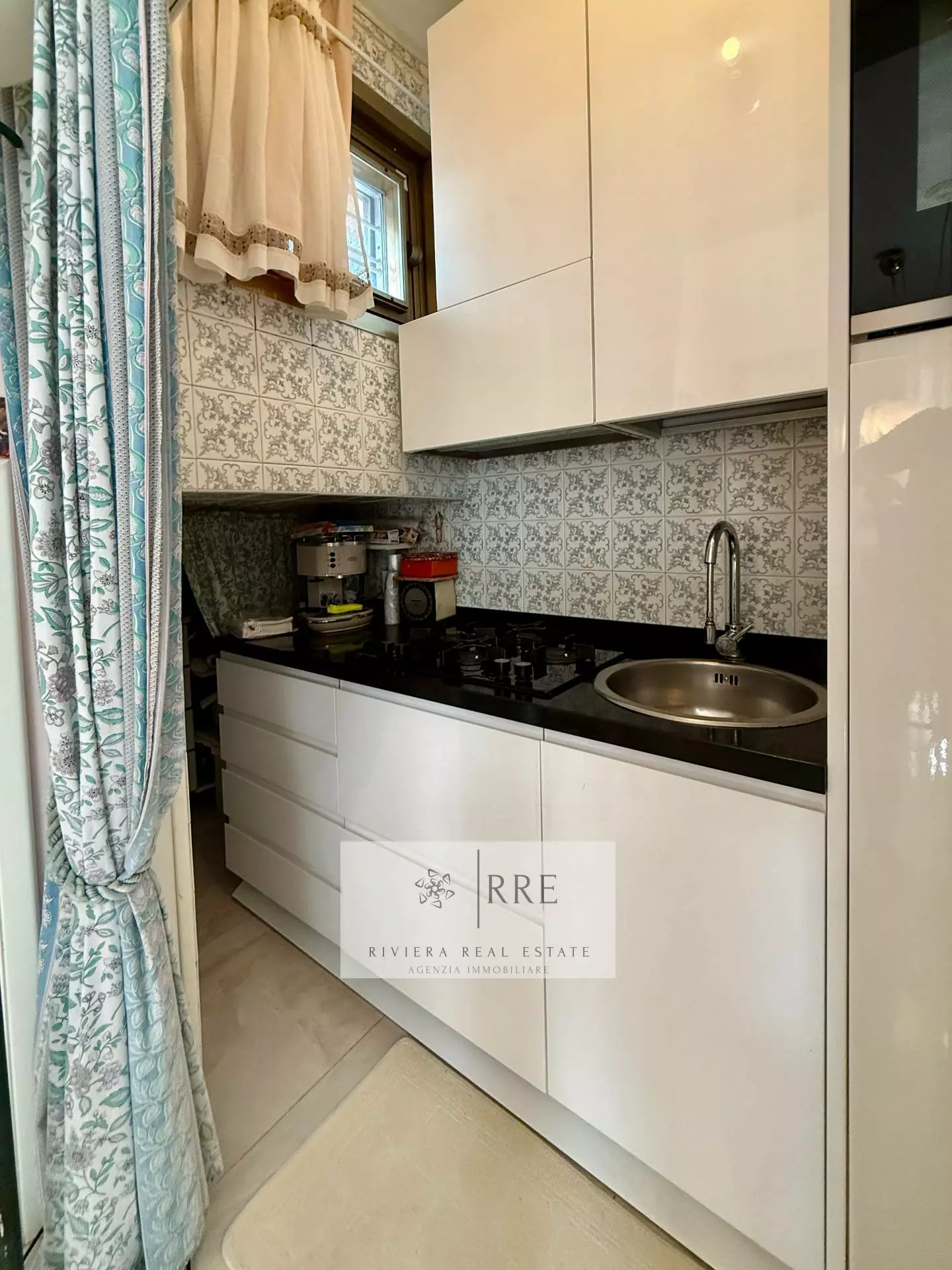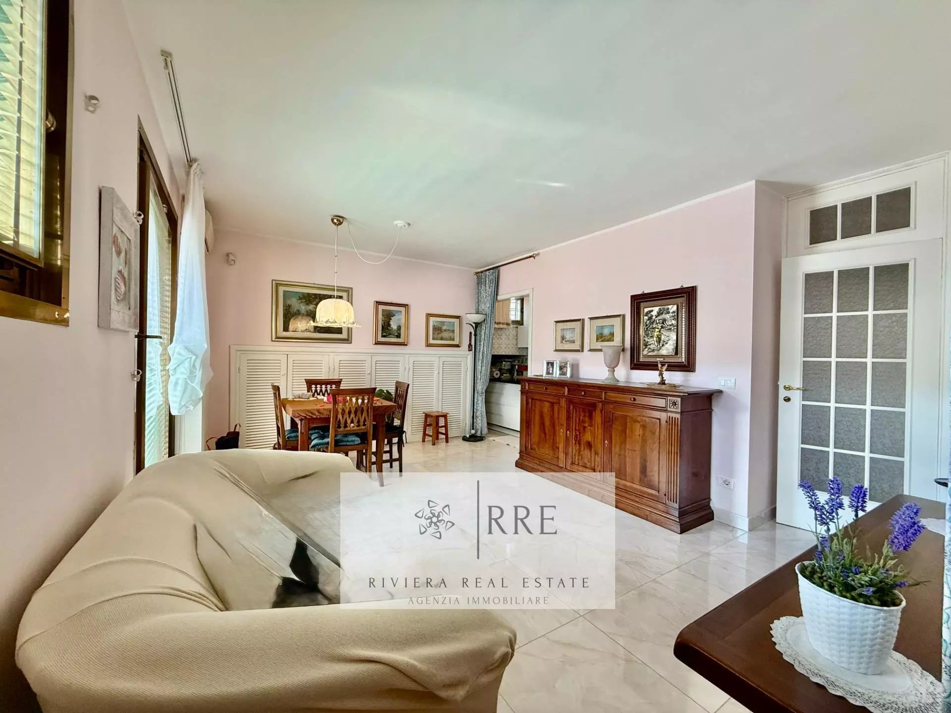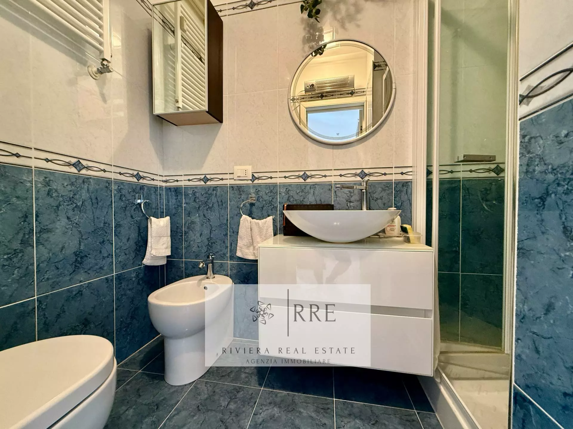 In Alassio, a coastal area of the Ligurian Riviera, there is an apartment available for sale that stands out. Positioned on the top floor of a building with an elevator, it offers a sea view. Included in the price are two private garages located beneath the building and a cellar.