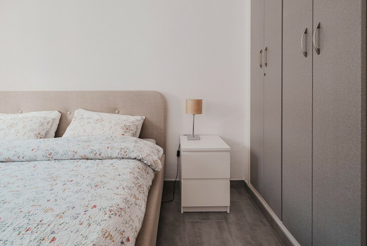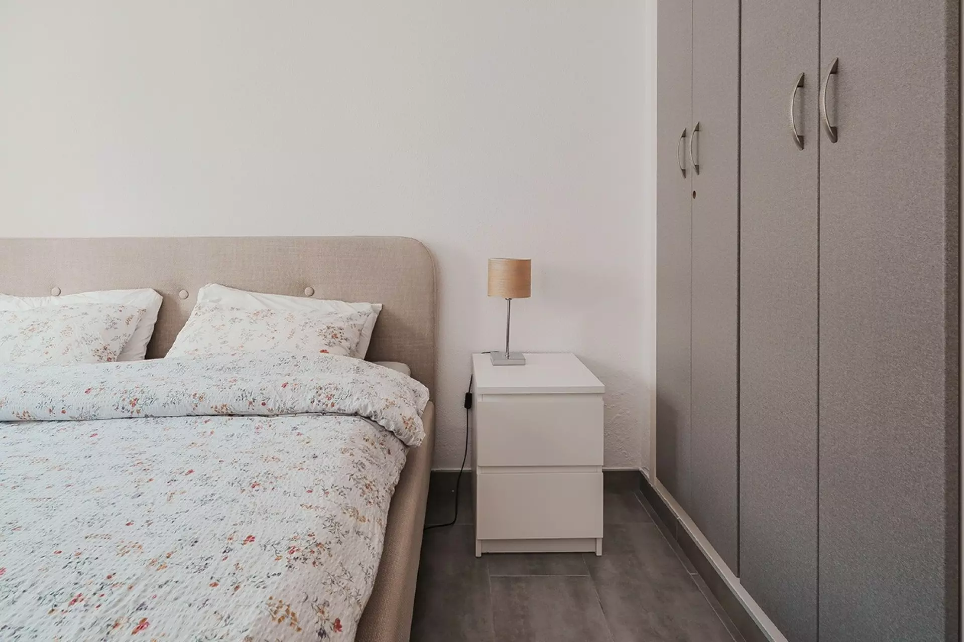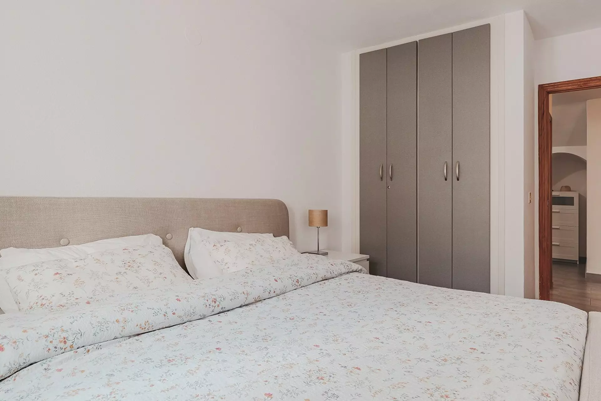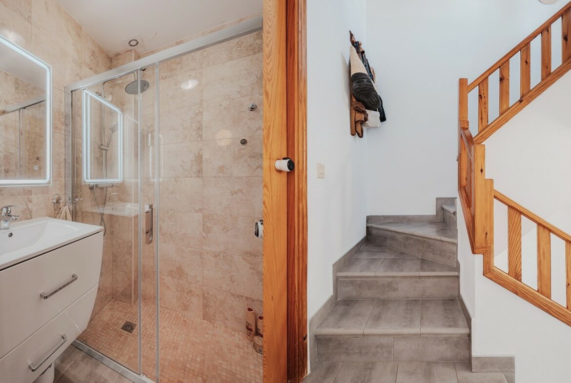 On the ground floor, you will find a living and dining area designed in a contemporary style. A modern fireplace is a functional addition to the space. From this area, access the large private terrace, which can be used for relaxing or outdoor dining throughout the year.