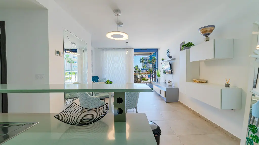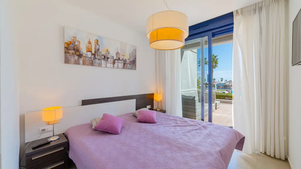 The apartments come equipped with a spacious terrace that offers expansive views. Inside, the layout includes two bedrooms fitted with large beds and two bathrooms, along with a living room designed for ease of movement and an open-plan kitchen. This configuration is practical for both residents and guests.