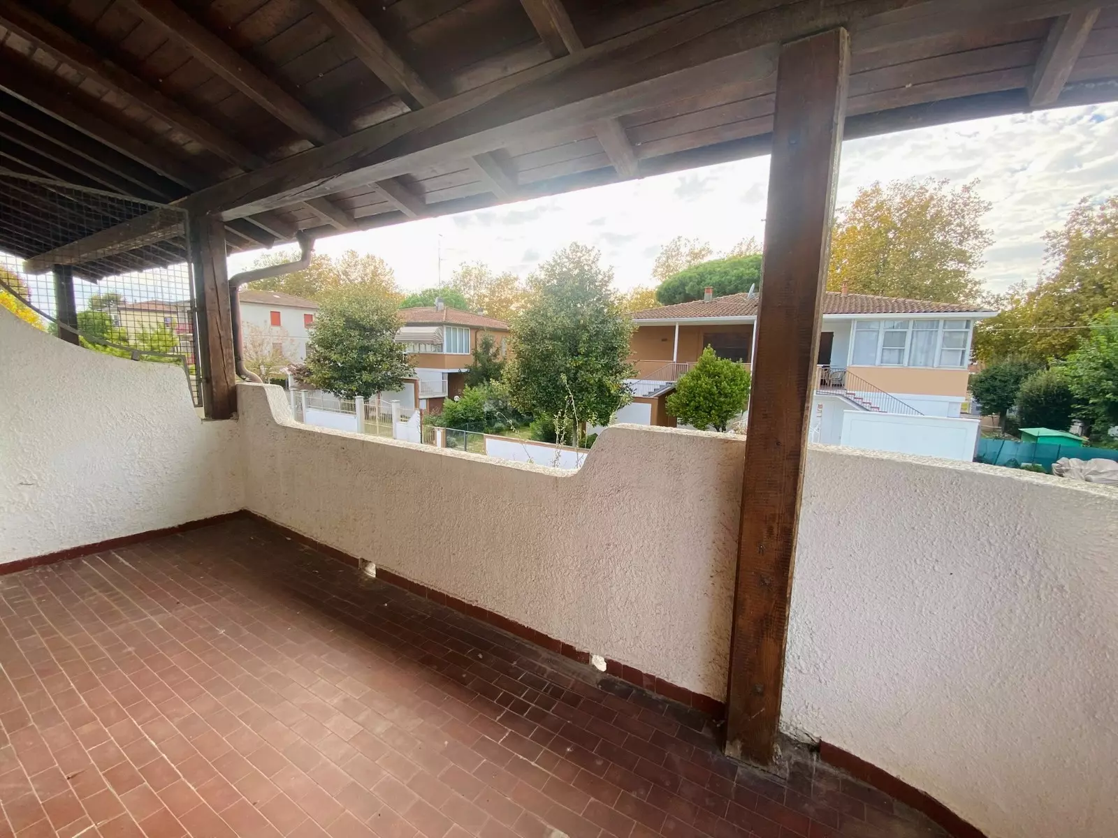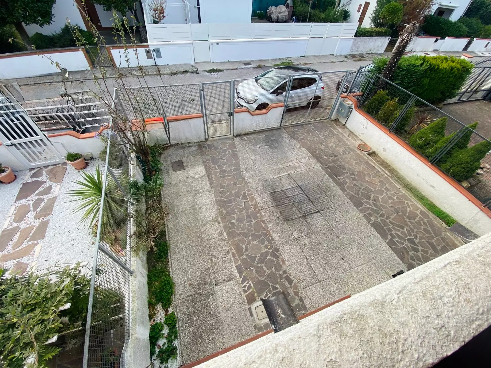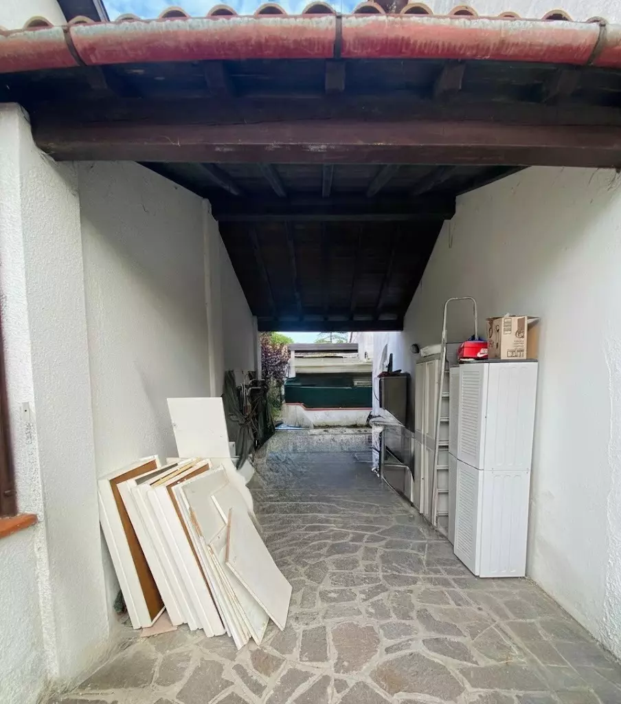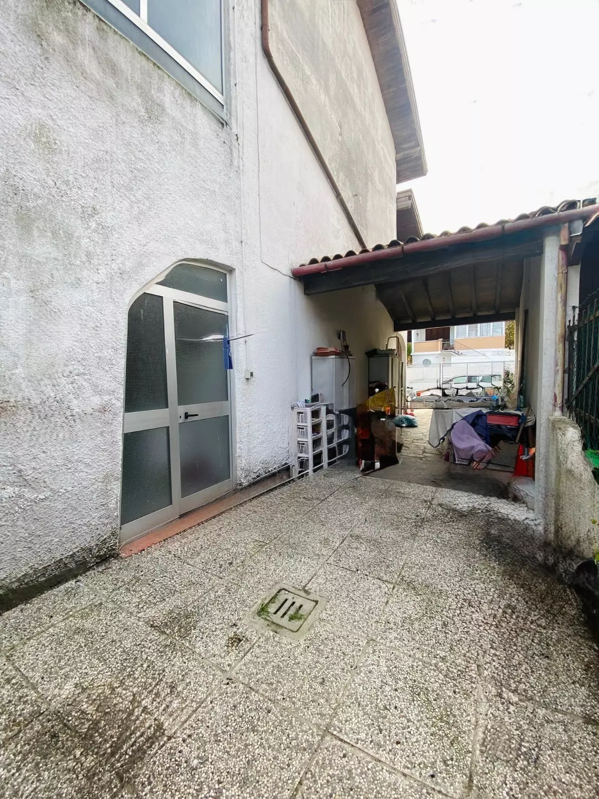 Accesso su ampio giardino piastrellato con doppio posto auto, lavanderia sulla parte posteriore del fabbricato, porticato abitabile d'ingresso, soggiorno, sala da pranzo con accesso al porticato posteriore verandato, cucinotto, bagno finestrato;