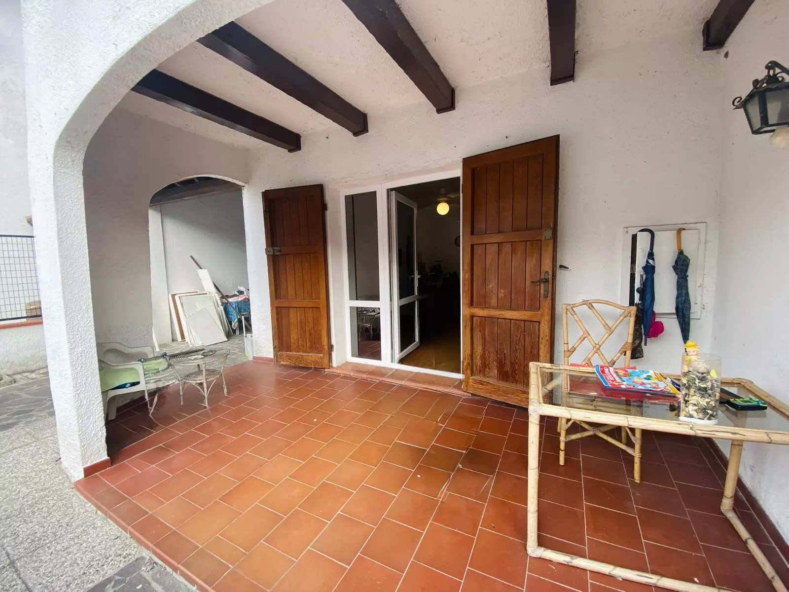 The entrance opens into a generous tiled garden, providing ample space for outdoor activities. There is a double parking area, and a laundry room is situated at the back of the building. The front porch offers an accessible living space, leading directly into the living room and dining area. From here, you can access the back porch, which has been enclosed with glass. The kitchen is compact yet functional, complemented by a windowed bathroom on the ground floor.
