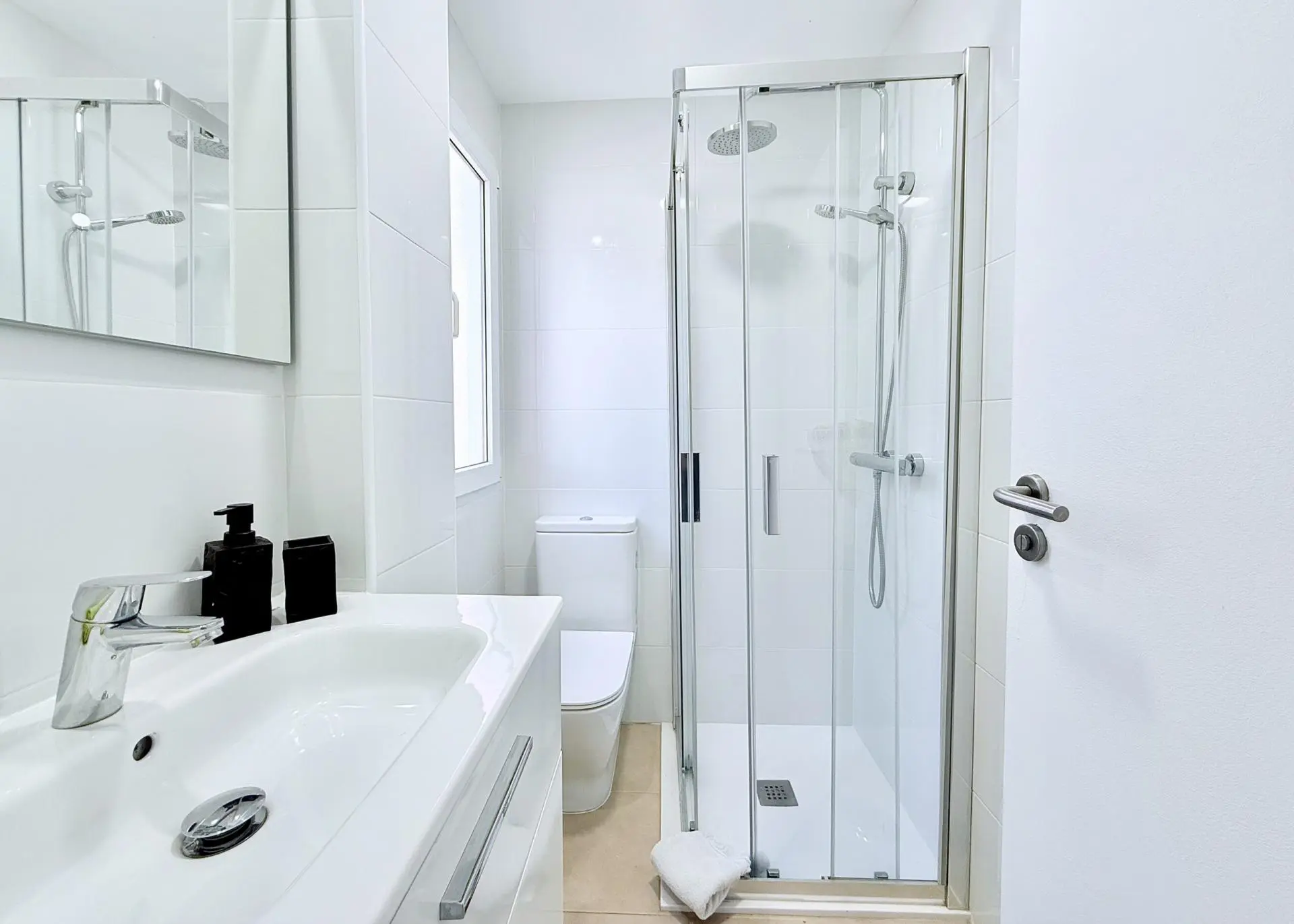 The ground floor of the villa is designed with an open-plan concept, promoting a sense of flow and connectivity. It includes a kitchen that has been upgraded. From the living area, doors open directly onto the rear garden, blurring the lines between indoor and outdoor living. A WC with a shower room is also situated on this level. Additionally, there is a covered rear terrace equipped with retractable awnings, offering flexible shaded outdoor space.
