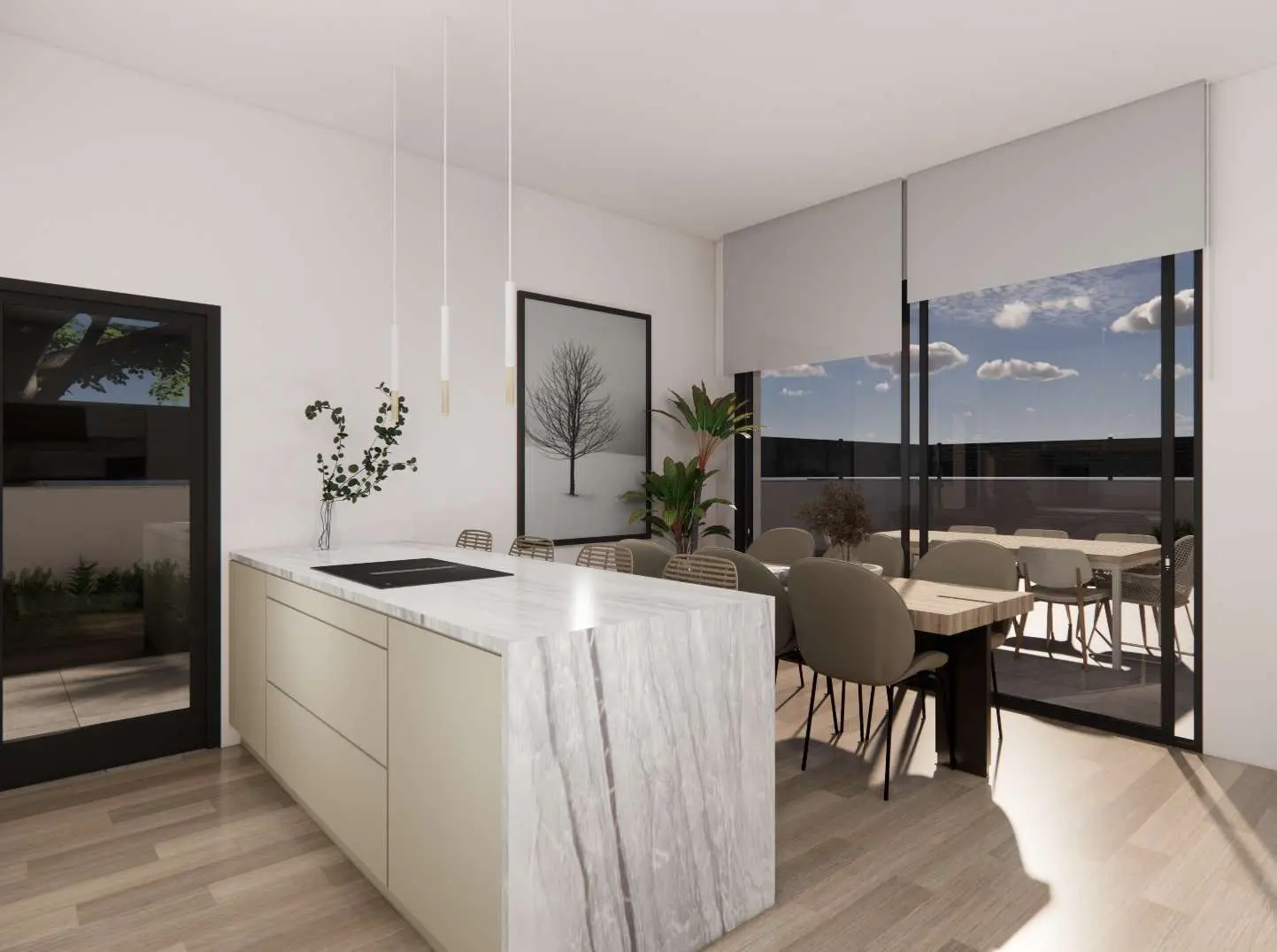 Enjoy the Mediterranean climate in your own private garden with a pool. Each home features outdoor spaces designed for relaxation and entertainment, including terraces perfect for al fresco dining or moments of rest under the sun. The added solarium provides a perfect spot to enjoy unparalleled panoramic views.