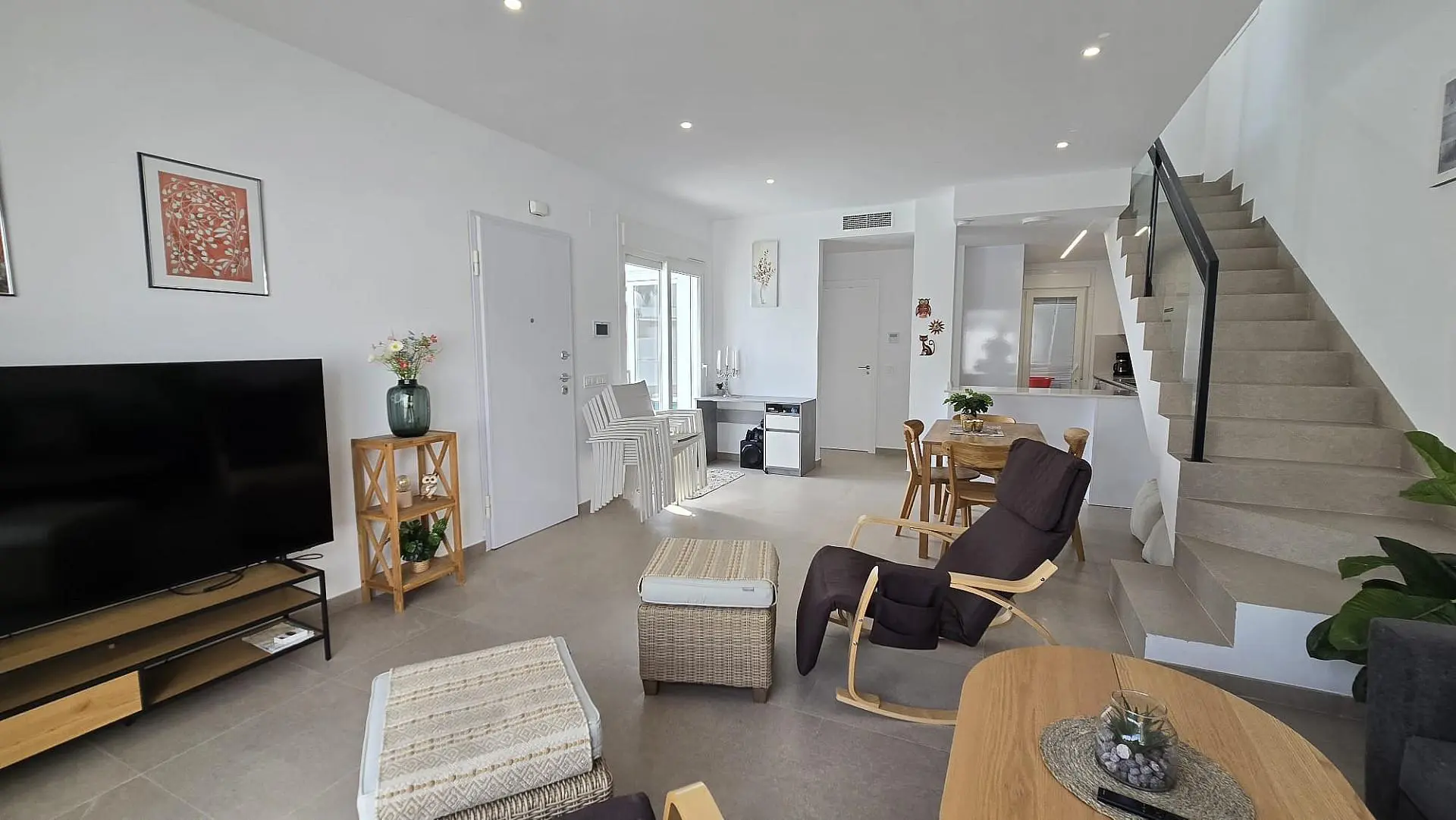 With 3 bedrooms and 2 bathrooms, there’s room for up to 6 people. The living area has direct access to the garden. The villa is fully furnished with materials and comes complete with garden furniture, lounge set, sunbeds, air conditioning, smart TV, washing machine, and a kitchen equipped with a dishwasher and freezer.
