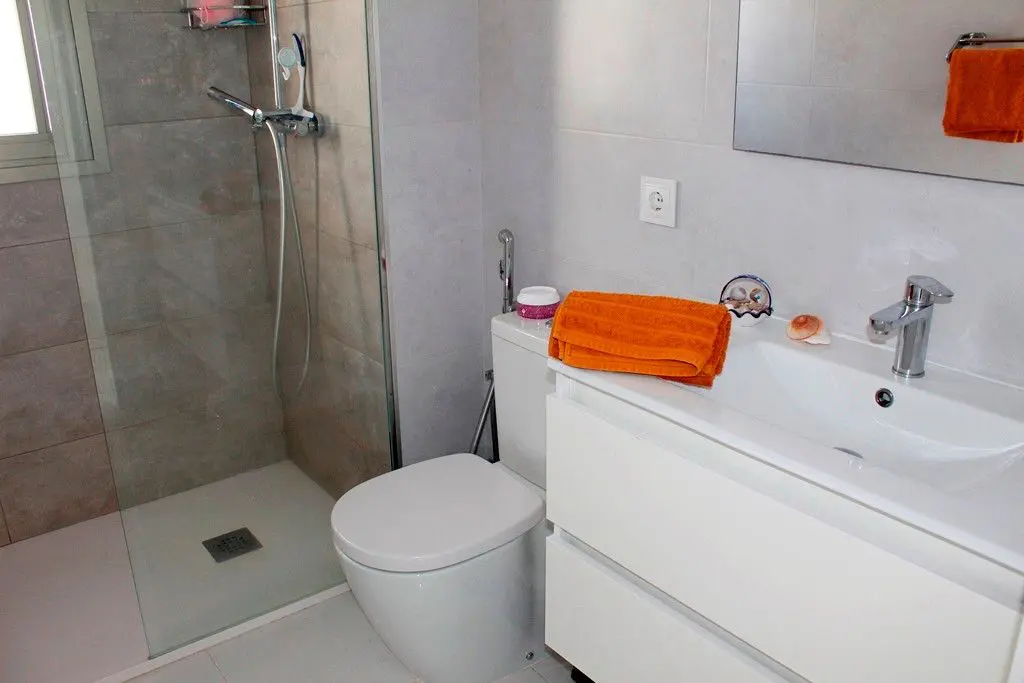 EXCLUSIVE “READY TO MOVE IN” modern and stylish 3 bed, 3 en-suite bathrooms FULLY FURNISHED DETACHED LUXURY VILLA, located in the quiet location of SAN MIGUEL DE SALINAS but only 3km away from the main village with plenty of amenities and within 10km of the vibrant commercial centres, shopping malls, golf courses and the crystal clear beaches of the Orihuela Costa! Coming into the large plot of 388m2 there is space to park the car inside with entrance via an electric gate, it has an easy to maintain garden/terrace area (all tiled) with a lovely private pool where you can catch the sun all day and enjoy the outdoors. The house is oriented south-east and benefits from plenty of natural daylight thanks to the open spaces and large windows. The villa has a beautiful spacious open plan living and dining area and comprises of a bright lounge/dining room with a fully-fitted kitchen with quality appliances, a bedroom with ensuite bathroom downstairs, 2 bedrooms with two ensuite bathrooms with shower and a terrace with nice open views upstairs. From the second-floor there are exterior stairs that lead up to the large unobstructed 49 m2 private roof terrace. From here you have amazing views of the rural countryside, salt lakes and the Mediterranean sea. This would make a wonderful area to sit and have a BBQ or have drinks with friends or just relax with a good book and enjoy the sun all day long. At the front of the property, you have a lovely seating area that gives you access to spacious and bright living room by sliding doors that overlook the pool. The property further benefits from large wardrobes in bedrooms upstairs, floor heating in 3 bathrooms, centralized hot and cold air conditioning, electric shutters and gate. The location of this luxury villa is close to various golf courses such as Las Colinas Golf & Country Club, Campoamor Golf, Las Ramblas Golf and Villamartin Golf. With beautiful open views over the rural countryside, you are just a 10-minute drive from the beaches of La Zenia, Playa Flamenca, Cabo Roig and Campoamor, plus close to supermarkets, restaurants and the popular shopping centre of La Zenia Boulevard with 150 shops or the Villamartin Plaza. Both Airports Alicante and Corvera Murcia are respectively only a 45 minutes’ drive. This is a high quality and beautiful villa in pristine condition and we highly recommend viewing!