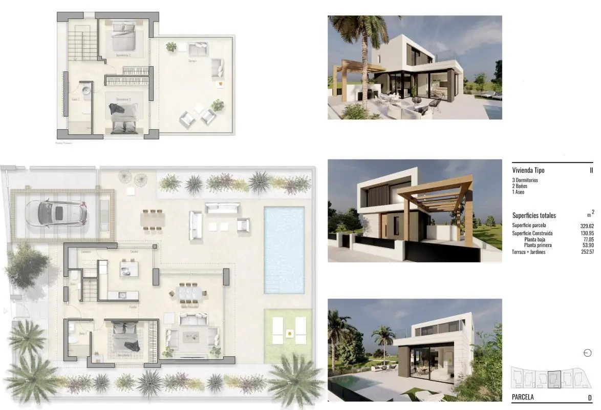 The villas feature three bedrooms. The master suite includes an en-suite bathroom, while the other two bedrooms share a fully equipped bathroom. All rooms have direct access to the outdoor terrace, creating an intimate and relaxing area to enjoy peace and serenity. With surface areas between 122 m2 and 130 m2, these villas offer ample living space for comfort.