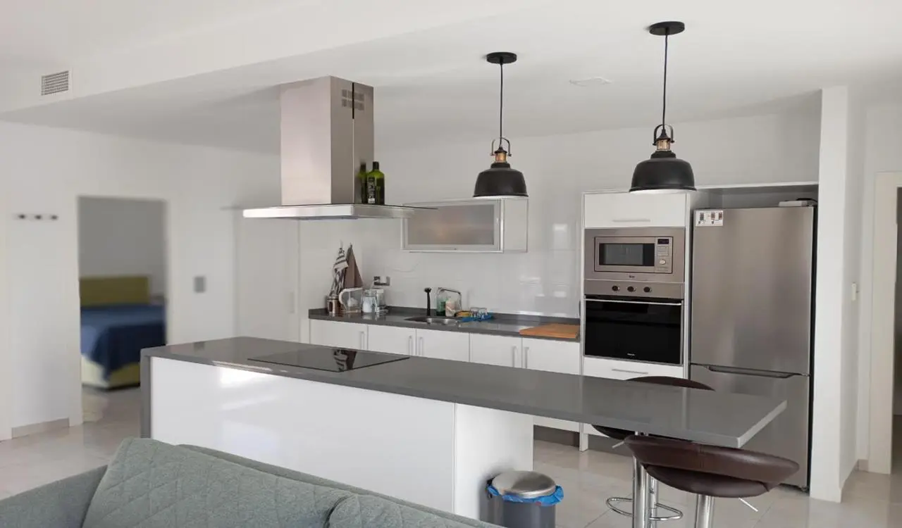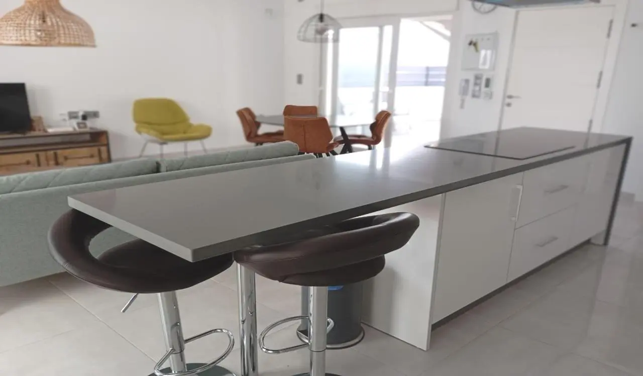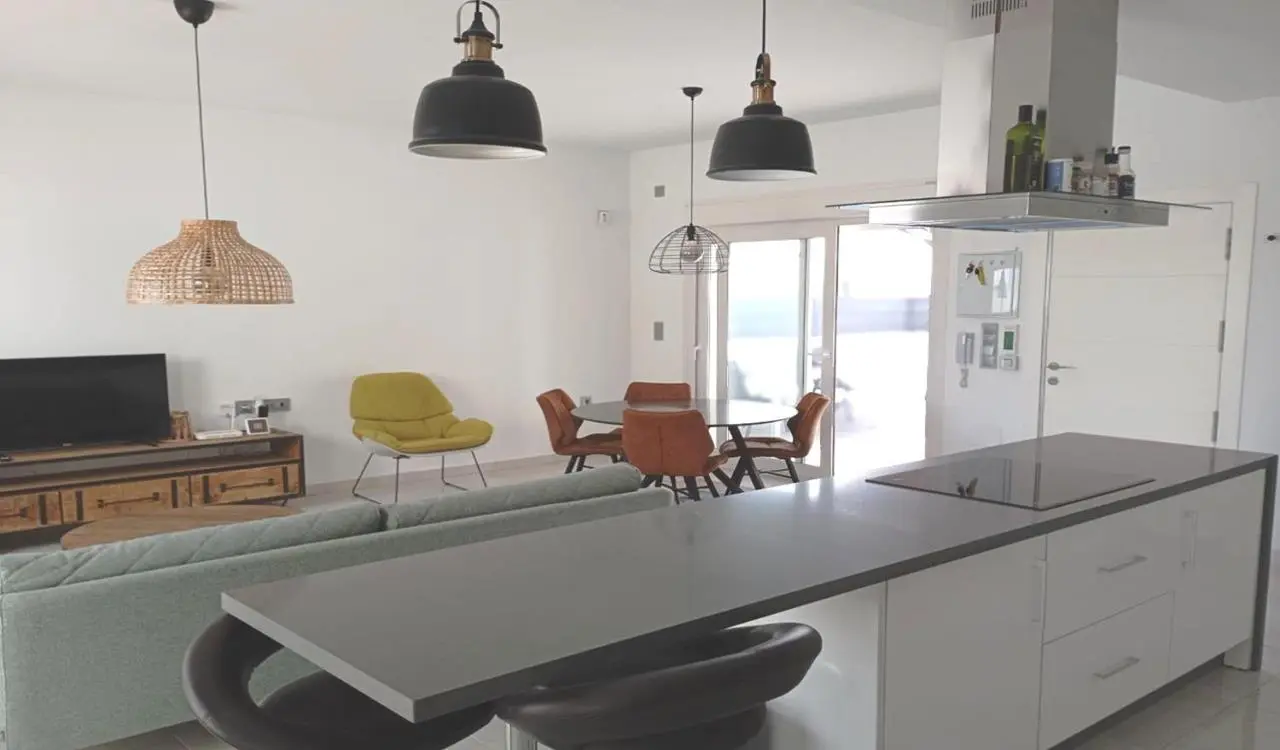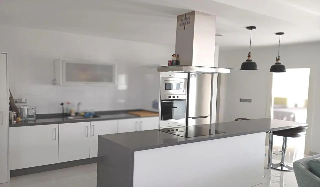 The villa is designed with three double bedrooms and three bathrooms. One of the bedrooms is located on the first floor and includes its own bathroom. The kitchen is fully equipped and features a central island. Adjacent to the lounge area, there’s a patio that can be accessed from the lounge or a bedroom. This area also houses a utility and storage room, contributing additional light to the lounge.