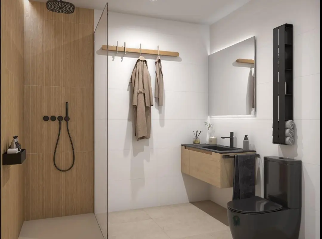 Each residence has been thoughtfully designed to optimize natural light and facilitate a seamless transition between interior and exterior areas. The central living space incorporates a living-dining area with an integrated kitchen and breakfast bar. This main living zone, exceeding 45 square meters, opens onto the outdoor space through a large sliding glass door spanning over 8 meters. This expansive opening effectively merges the interior and exterior, creating a continuous area of more than 80 square meters that includes the terrace and private pool, acting as an extension of the living space.