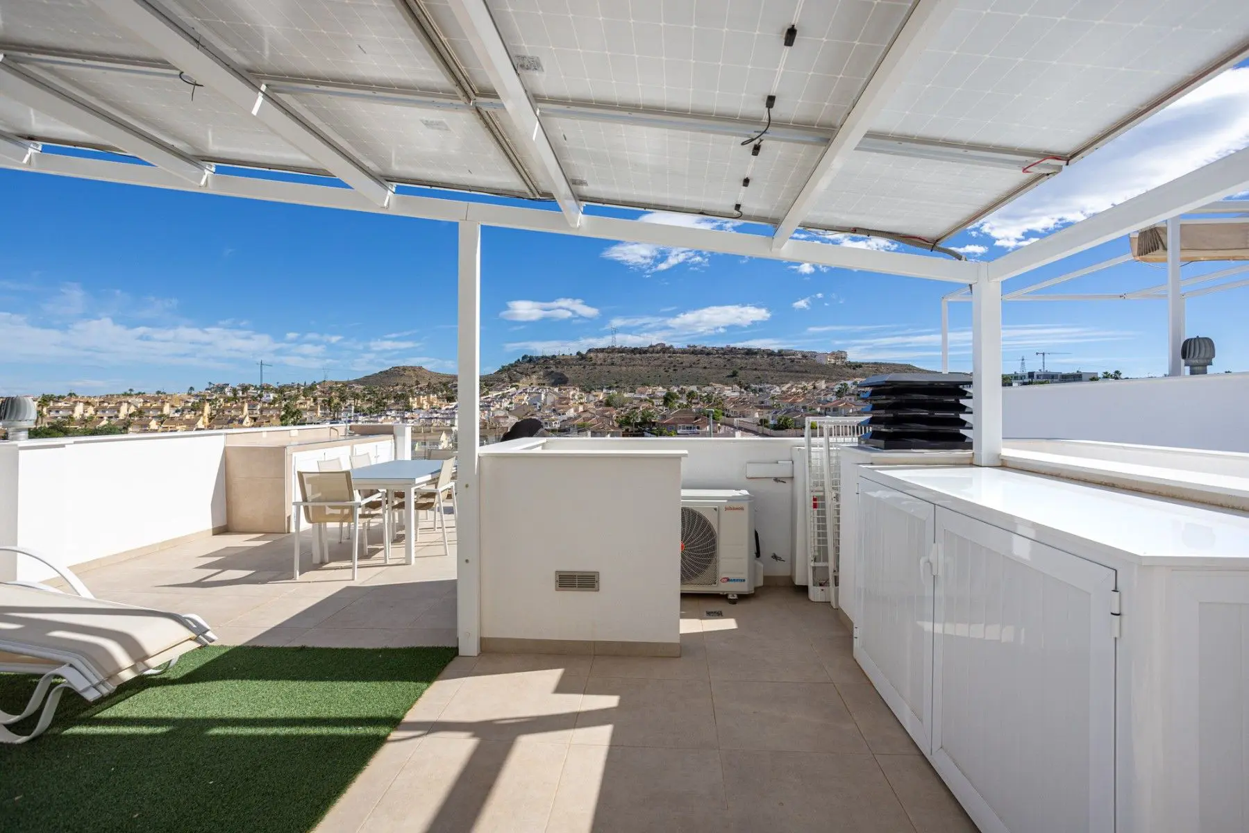 Welcome to Benijofar, one of the most sought-after and fastest-developing villages on the Costa Blanca – the place to be for those who want to combine modern living, tranquility, and a vibrant lifestyle. On a unique location overlooking a beautiful green park, this stylish townhouse from 2018 is in perfect condition and offers every imaginable comfort and luxury. * Location & ViewWith no building possible across the park, you can enjoy uninterrupted views, peace, and privacy. At the same time, the charming center of Benijofar with restaurants, shops, and amenities is just a short walk away.* Home & ComfortThe property radiates modern design and functionality, featuring a bright open-plan living area flowing seamlessly into a fully equipped kitchen. Large windows flood the space with natural light and connect directly to the terrace and private pool – heated with a heat pump for year-round enjoyment.There are three full bedrooms, each with its own en-suite bathroom. One is currently used as a dressing room and another as an office, but both can easily be reverted into bedrooms – ideal for flexibility.* Sustainable & SmartEquipped with solar panels and an electric car charging point, this home combines comfort with eco-friendly living.* Extras that Make the Difference- Private heated pool- Solar panels & EV charging point- Spacious rooftop solarium with panoramic views- Plenty of storage space- Sold fully furnished – what you see is what you get!* Ready to Move InWith refined architecture, premium finishes, and excellent maintenance, this home is truly turnkey — just unpack your bags and enjoy Mediterranean living. Perfect as a main residence, holiday retreat, or investment in one of Spain’s most popular areas.
