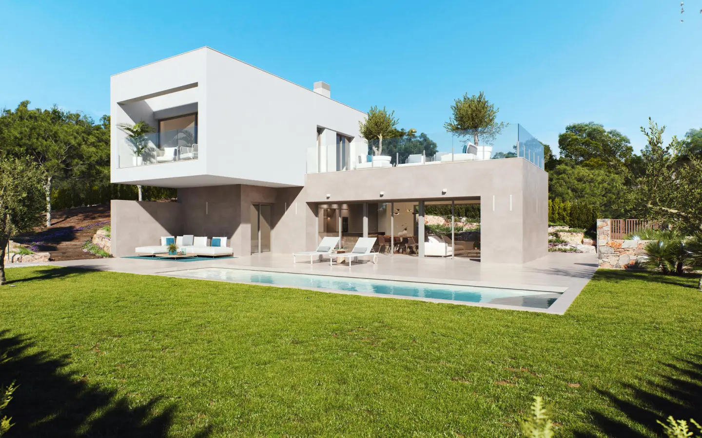 Enjoy the Mediterranean climate to the fullest in outdoor spaces designed for your well-being. Each property has its own private garden, where you can create a personal corner of peace and relaxation. The spacious terraces are designed for outdoor dining or moments of rest after an active day. Additionally, each home includes a private pool that adds an exclusive touch, allowing for refreshing swims without leaving home. These outdoor environments ensure privacy and comfort, making them the ideal place to share memorable experiences.
