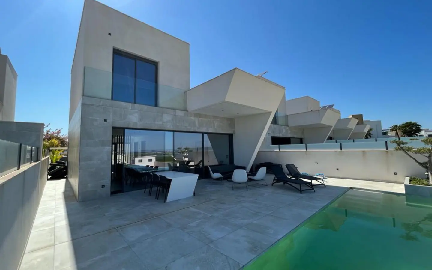 This luxury designed detached villa has stunning views over Guardamar and the Mediterranean Sea and is designed to fully enjoy the magnificent views towards the skyline of Guardamar. A combination of sea views, nature and a luxurious lifestyle within walking distance of Quesada and Rojales with all the amenities at hand. Sustainable design, high quality finishes and the unique location distinguish this villa as one of the best of the Costa Blanca. 5 en-suite bedrooms with terraces looking over the Sierra del Recorral. From the infinity pool you can enjoy the beautiful views and the nature that Rojales has to offer. On the ground floor there is a large open plan lounge/kitchen leading out to a sunny terrace with infinity swimming pool, a double bedroom with en-suite and a guest toilet. Upstairs there are two double bedrooms with en-suites. The basement has an english patio so there is natural light with two double bedrooms with en-suites opening into the english patio, a large games room/play area, sauna, shower room/toilet, a laundry room and garage. Includes Siemens Hob, Hood, Fridge, Dishwasher, Combi Oven/Microwave. Non residents tax 850 euros per year. The unique and sustainable villas of residential Oceanic are designed to fully enjoy the magnificent views towards the skyline of Guardamar. A combination of sea views, nature and a luxurious lifestyle within walking distance of Quesada and Rojales with all the amenities at hand. Sustainable design, high quality finishes and the unique location distinguish the Villas of Residential Oceanic as one of the best of the Costa Blanca.