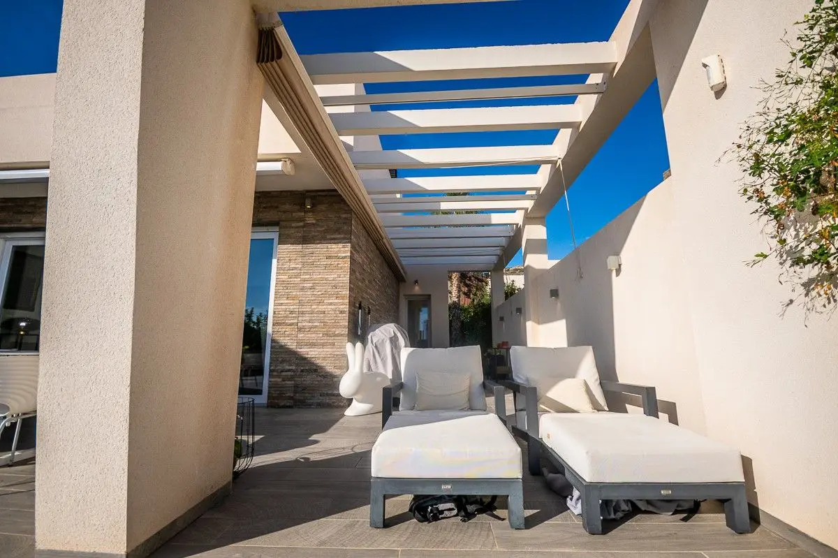 Stunning Detached Villa with high-end extra´s at La Finca Golf Resort – AlgorfaThis unique villa, situated on a spacious 500m2 plot, offers a perfect blend of modern comfort and Mediterranean charm. The bright, open-plan layout seamlessly connects the living area, kitchen and dining space, all opening onto an impressive L-shaped terrace, beautifully landscaped garden, and a private pool. Thanks to the large windows, natural light floods every corner of the home, creating a warm and inviting atmosphere.The terrace, partially covered by a stylish pergola with electric awnings, is the ideal spot to relax or entertain — a perfect setting to enjoy the Mediterranean climate all year round.Originally designed with three bedrooms, the current owners have customised the layout into a more spacious two-bedroom configuration. With minimal effort, the villa can easily be converted back into a three-bedroom home. The 3th bedroom can be constructed again if the buyer wishes this.Do you drive electric? Your own charging point is already installed, and the house has 3-phase selectric wires fitted up to 400VThis villa is equipped to the highest standard:Zoned hot/cold air conditioningUnderfloor heating in the bathroomsSecurity system with video surveillanceSmart home automationElectric shuttersPrivate pool with outdoor showerCharging point for electric vehiclesMultiple electric awningsPrivate parking with automatic gateColorful garden with fruit treesHigh-tech extras throughout the houseThe mature garden surrounds the villa with fruit trees and aromatic plants, offering privacy and a sense of tranquillity.The kitchen is a true highlight — fitted with high-end Miele appliances and finished to the very best quality standards. There is even a basement that still needs to be finished wher you have more then 100m2 to make your own extra rooms, mancave or bodega.. Located within the prestigious La Finca Golf Resort in Algorfa, at the heart of the Vega Baja, this home offers access to exclusive amenities: fine dining restaurants, a luxurious 5-star hotel with spa and gym, an elegant clubhouse, and the renowned La Finca 18-hole golf course.Just a short drive away you’ll find the beautiful beaches of Guardamar and Torrevieja, where the sun shines over 300 days a year. Both Alicante and Murcia airports are within easy reach — 40 and 55 minutes respectively.A truly exceptional villa, offering peace, luxury and the perfect Mediterranean lifestyle.