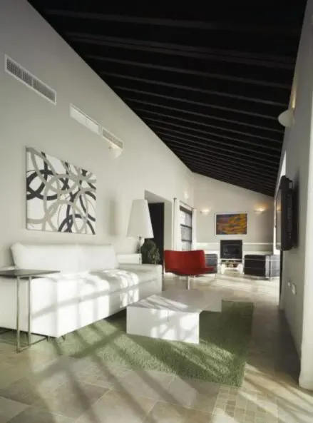 The roof of this home features a sloped design, incorporating a varnished wooden structure that contributes a warm and sophisticated aesthetic. For those who enjoy a cozy atmosphere, there is a fireplace equipped with a cast iron hearth, ideal for creating a welcoming ambiance during cooler periods. Security is a key consideration, with a reinforced entrance door providing an extra layer of protection.
