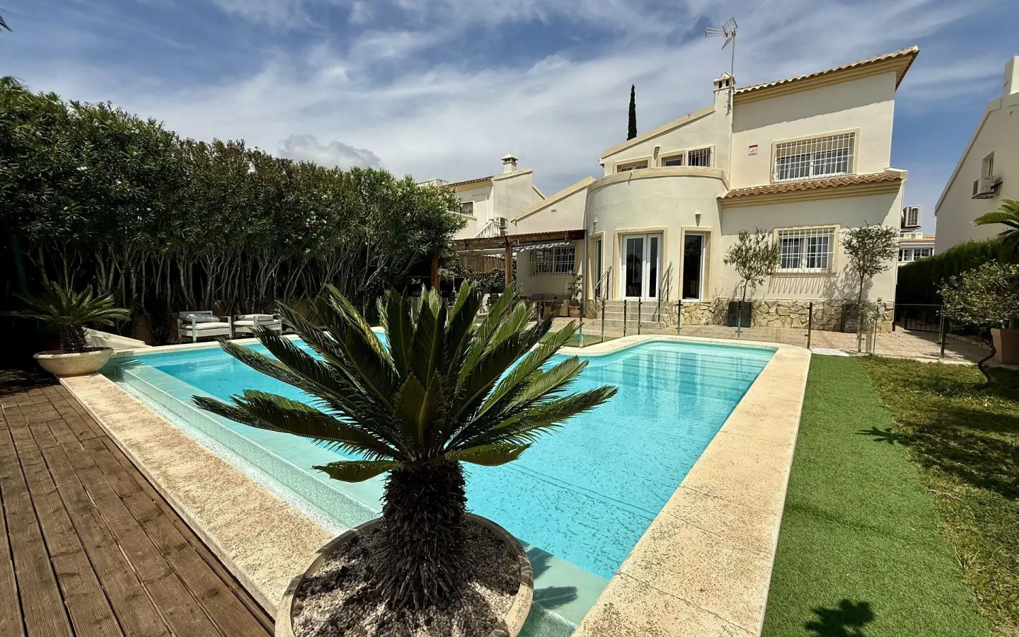 Beautiful Golf Villa surrounded by serene nature!. Visit this beautiful villa surrounded by serene nature. This fully renovated family home offers the perfect balance of modern comfort and ultimate privacy, ensuring you can enjoy your space peacefully. With two floors of thoughtfully designed living space, this property is the perfect sanctuary for those seeking peace and luxury. As you enter the villa, you’re greeted by a cosy living and dining area seamlessly flowing into an open-plan kitchen. Large windows frame the view of the sparkling swimming pool, creating a bright and airy atmosphere. The ground floor also features two well-appointed bedrooms, a sleek, modern bathroom, and a practical laundry room, providing convenience and functionality with plenty of storage space. Upstairs, you’ll find two additional spacious bedrooms with plenty of natural light and built-in storage. The highlight of this floor is the luxurious bathroom, designed with high-end finishes to create a spa-like retreat. From the top floor, step out onto the private terrace, where you can enjoy breathtaking views of the sea and the golf course, perfect for relaxing or entertaining guests. The villa’s garden has been designed for ease of maintenance, offering plenty of space to park vehicles and enjoy outdoor living. The large swimming pool is a standout feature, with a glass separation that enhances the connection between the pool area and the adjacent BBQ and chill-out zone. Whether hosting a gathering or enjoying a quiet day by the pool, this outdoor space is ideal for unwinding and taking in the peaceful surroundings. With privacy, luxury, and stunning sea views, this villa offers a truly exceptional living experience. It is perfect for those who value tranquillity, style, and a connection with nature.