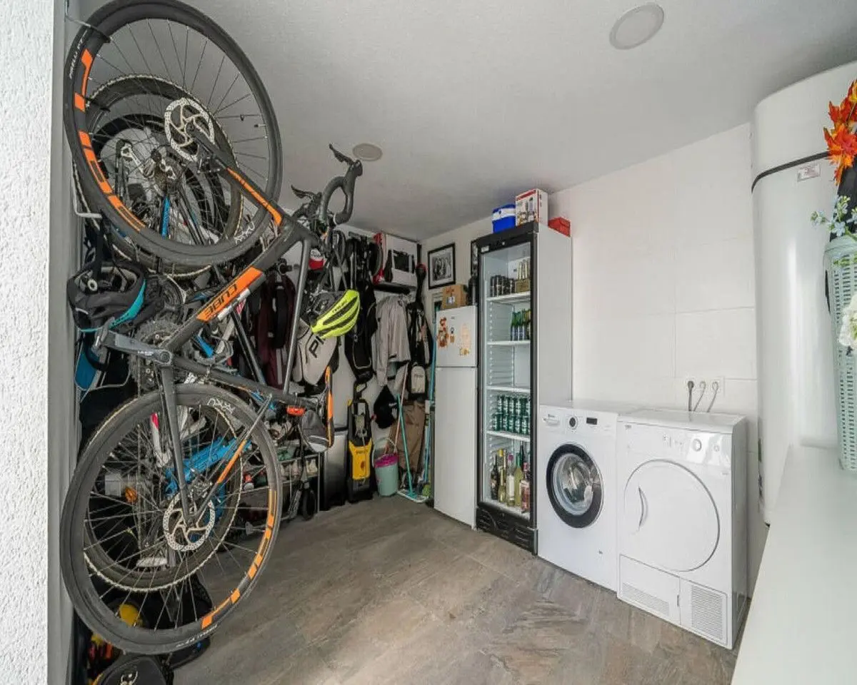 Beyond the kitchen area lies a remarkable space unique to this villa—a large storage room specifically designed for storing bicycles, golf clubs, and other recreational equipment. The current owners have ingeniously transformed this space into a practical haven, complete with a wine fridge, ice cream freezer, and laundry appliances, further enhancing the functionality and appeal of this exceptional villa.