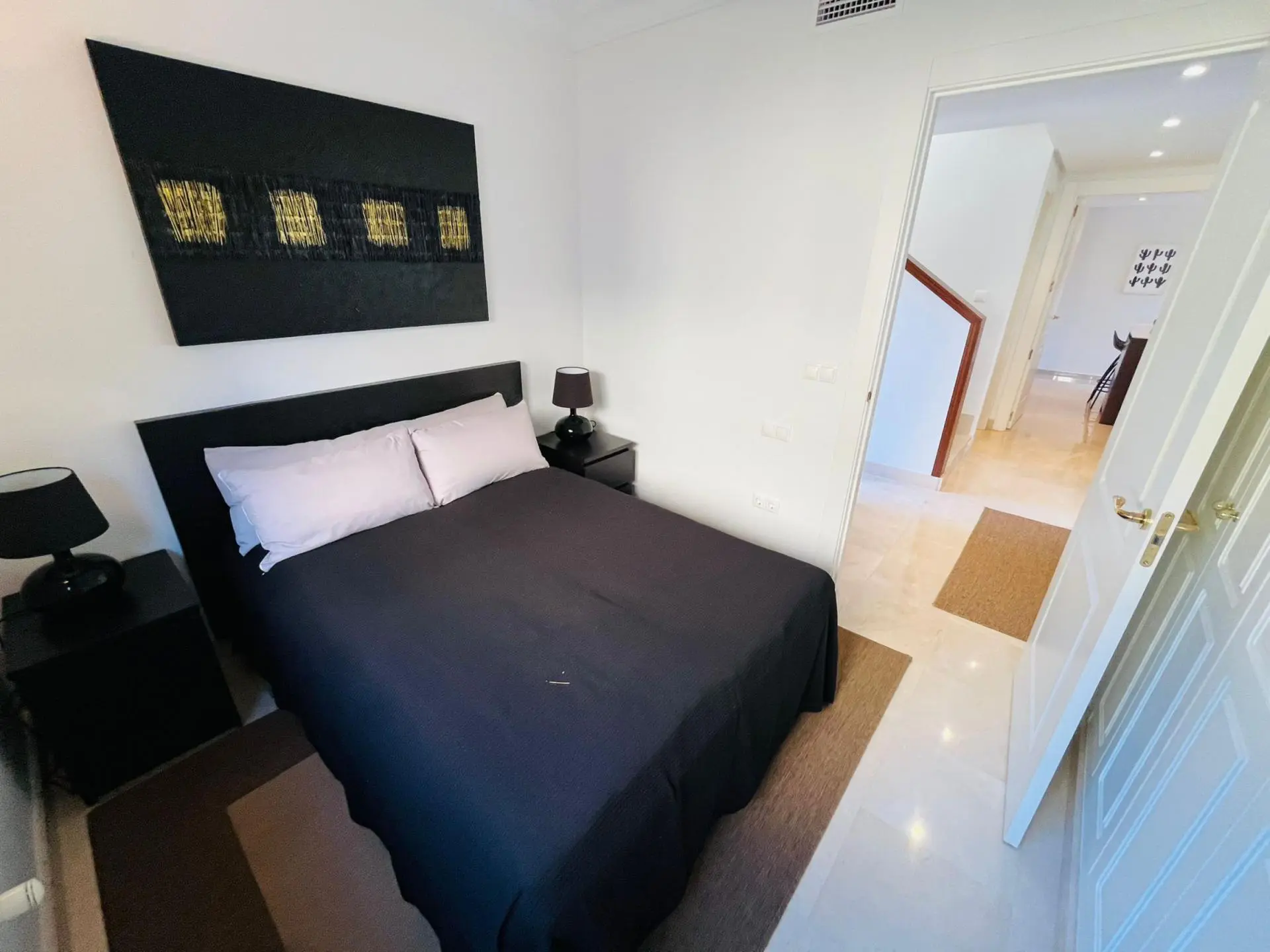 Upstairs, the master bedroom has an en-suite bathroom. A second double bedroom has access to a private terrace with views of the golf course. There is also a shower room on this level.