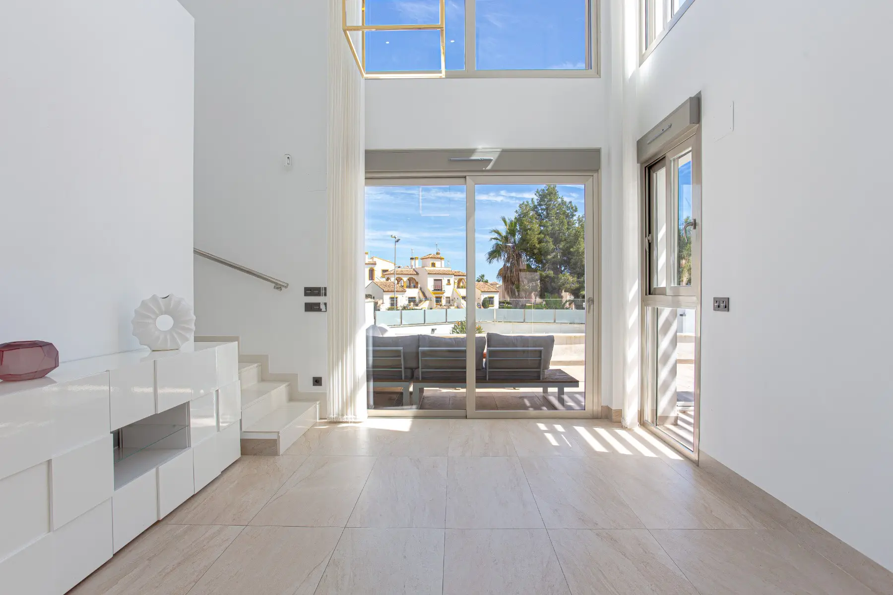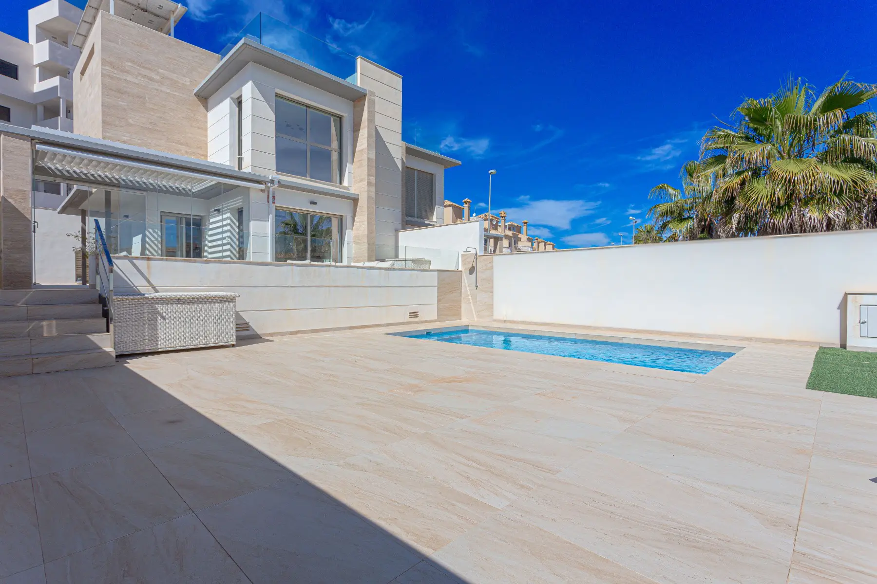 Modern villa for sale in Villamartin, Orihuela Costa, built in 2019, featuring 4 bedrooms, 3 bathrooms, private pool, solarium, and solar panels. With 150 m² of living space on a 320 m² plot, this property offers a spacious and elegant layout across three levels. The ground floor includes a bedroom and a bathroom with walk-in shower; upstairs you’ll find two more bedrooms, another bathroom, and access to a sunny terrace and private solarium. The basement adds extra versatility with a fourth bedroom, a third bathroom, and a generous living area.This south-facing villa comes almost fully furnished and includes a bioclimatic terrace, private parking, and a large outdoor area perfect for relaxing or entertaining. Energy-efficient thanks to solar panels, a battery system, and an EV charger, this is an ideal eco-friendly home.Located close to golf courses, beaches, international schools, and all amenities, it’s perfect as a permanent residence, holiday home, or investment property in Costa Blanca. Don’t miss this opportunity—contact us today to arrange a viewing!