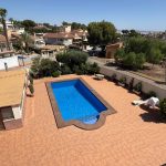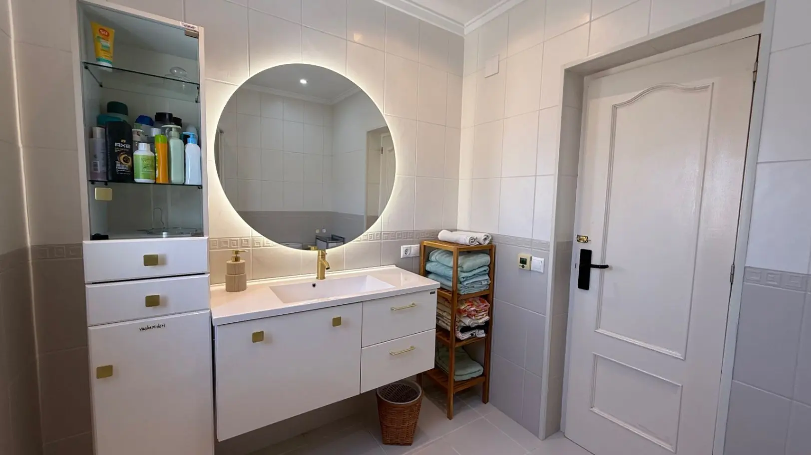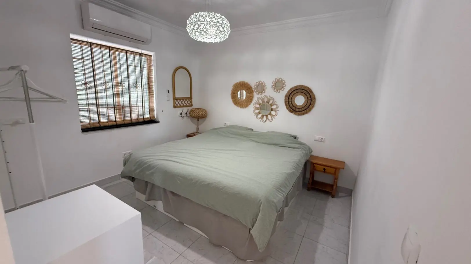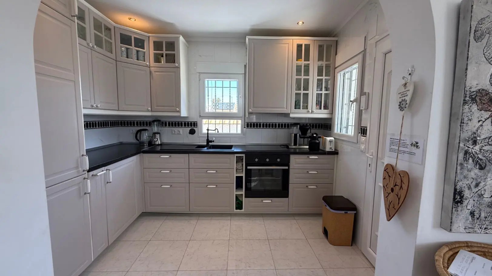We are presenting a three-bedroom, two-bathroom detached villa. It is situated in the El Chaparral / San Luis area of Costa Blanca South. The property sits on a plot of approximately 800 square meters. It offers privacy, space, and a particular style. Walls surround the property, and there is a secure entrance. This creates a calm and welcoming atmosphere upon arrival.