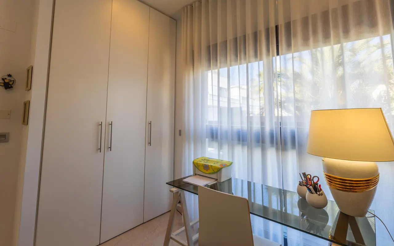 The villa itself measures 160 square meters and is spread across three levels. It features three bedrooms and three bathrooms. The ground floor comprises a living area, a kitchen, one bedroom, and one bathroom. The design of this level is open plan, intended to facilitate combined living and dining activities. Moving to the upper floor, you’ll find two more bedrooms and two bathrooms. This level also includes a terrace, accessible from the master bedroom, which offers broad views. A notable feature across all bathrooms is the inclusion of programmable underfloor heating.
