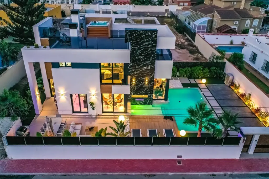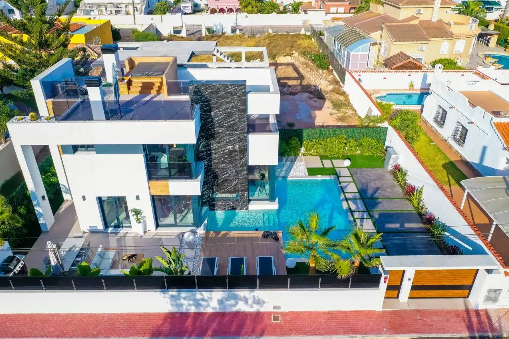 Modern villa for sale in TorreviejaWe offer for sale this development of new built villas with private pool in one of the most desirable areas of Torrevieja – La Florida.The villas are set on fully fenced plots, which start at 360 square meters. The property itself is composed of 3 bedrooms and 3 bathrooms, a large living room, kitchen and solarium. Inside you will find air conditioning pre-installation and private pool. The villa is built from high quality materials using modern technology. Maximum constructive qualities to achieve the highest levels of comfort. The villas also benefit from efficient water heating system from Aerothermia. Optional for extra payment: finished basement (80.000 €) and domotic system. Torrevieja is a tourist town on the Costa Blanca, a favorable climate and environmentally friendly nature with two salt lakes located within the city limits. The city stretches along the coast and therefore all the sandy beaches of the city are within walking distance. Infrastructure of the city perfectly developed. There are shopping centers, sports complexes, a nature preserve, many bars and restaurants