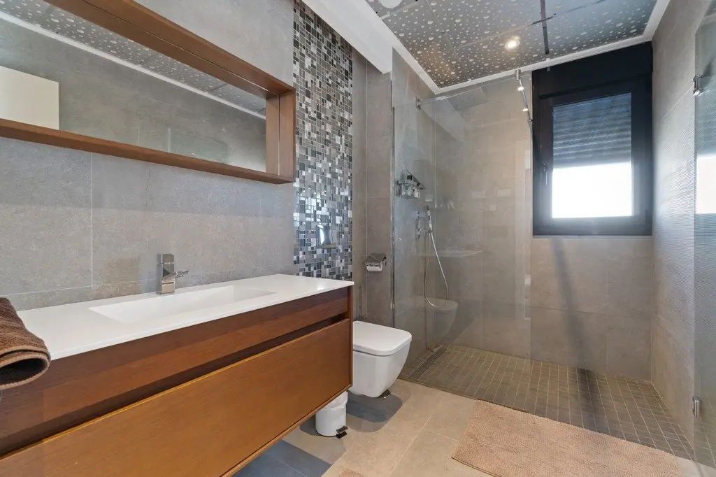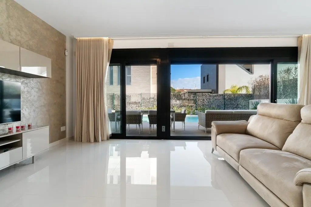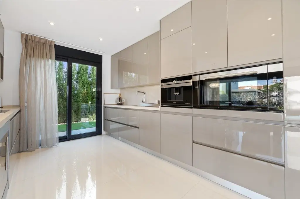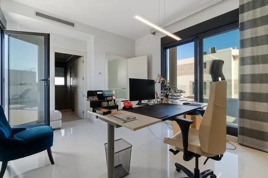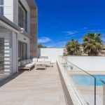 Modern style luxury villa located in Campoamor, only 300 m from the beach. Villa with an area of 200m2, built on a plot of 500m2, the house has 4 bedrooms, 3 bathrooms, living room, kitchen, terrace and solarium of 46m2 with sea views. The outside part has a private pool 8×4. Underfloor heating in the bathrooms, centralized air conditioning installed, parking on the plot. Top quality materials. Heated saltwater pool. It is close to all services, schools, just 10 minutes by car from the largest shopping center in Alicante, Zenia Boulevard, 40 minutes from Alicante airport and a few minutes from some of the best golf courses.