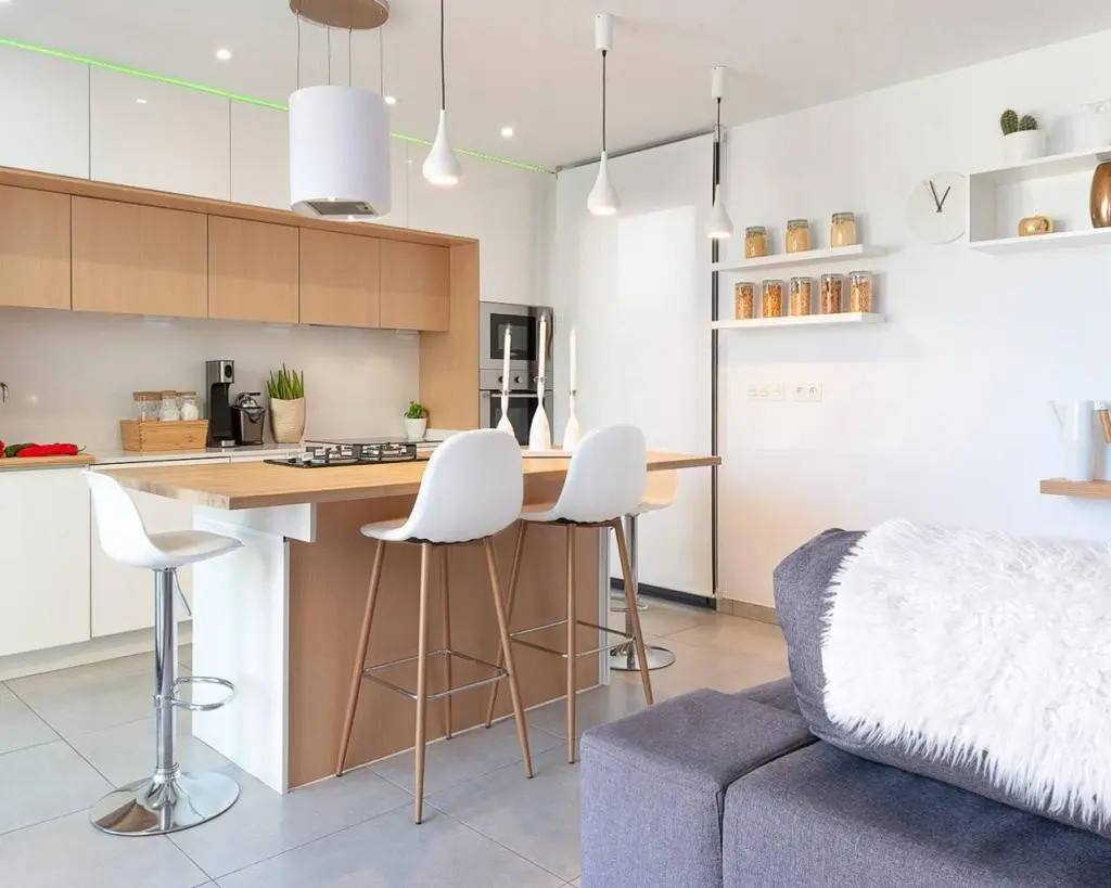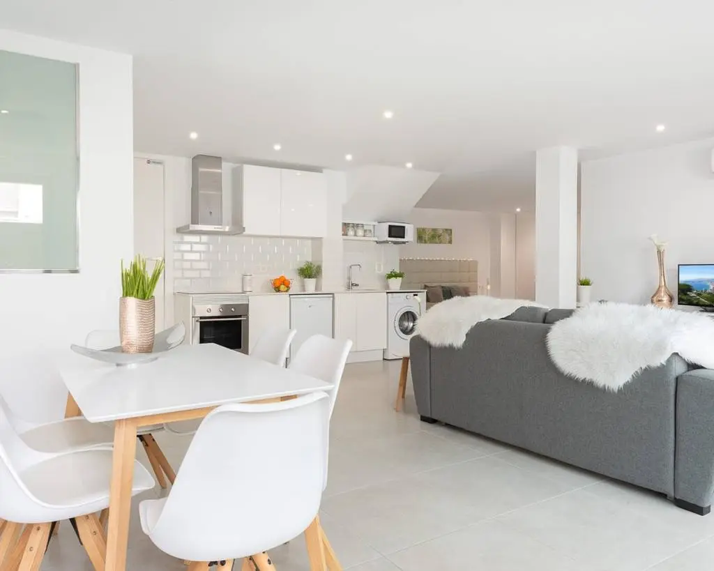 The modern villa holds a tourist license, providing opportunities for rental income, which the current owner has successfully utilized. The main living area is open plan, featuring a lounge and dining room with stairs leading to the first floor. The fitted kitchen includes an island unit and a door leading outside. A utility room is conveniently located along with a family shower room on this level. A double bedroom on the ground floor features a walk-in wardrobe and sliding doors that open to the pool area.