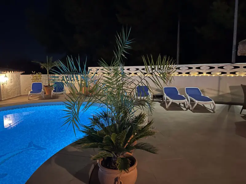 Fantastic villa located high up on the hill in Albir. The view is fantastic where you can see the mountains around Albir from Benidorm in the south to Calpe in the north. The villa is located in a quiet and attractive area of Albir, with close proximity to the world-famous luxury/spa hotel called SHA. It is also a short way down to the beach.The home itself is located on an unobtrusive corner plot with an exquisite view. With a total size of 208 square metres, you have plenty of space for the whole family. The plot contains a private pool, outdoor kitchen, garden with fruit trees and several zones for enjoying the sun.The home is over two floors and contains four bedrooms (one en-suite) and two modern bathrooms with the option of furnishing with an extra bathroom and bedroom if desired.When you enter the home, you see a high ceiling and a great fireplace that stretches all the way up to the ridge. Get a bit of a feel of and enter a Caribbean house. The kitchen is new and modern and contains everything you need for a comfortable lifestyle, including induction hob, water purification, wine cabinet, double fridge etc.On the same floor you will find a guest toilet and a spacious living room with access to a large terrace with a lovely view.The outdoor areas are the real highlight with a swimming pool with diving board, terraces with a view, an outdoor kitchen under a roof, a toilet and large stalls.Here you can enjoy gatherings and meals because of the beautiful outdoor kitchen.The home is planted so that you get many beautiful separated zones on the property.The home is sold fully furnished, so you can move right in. ref:VIL_3