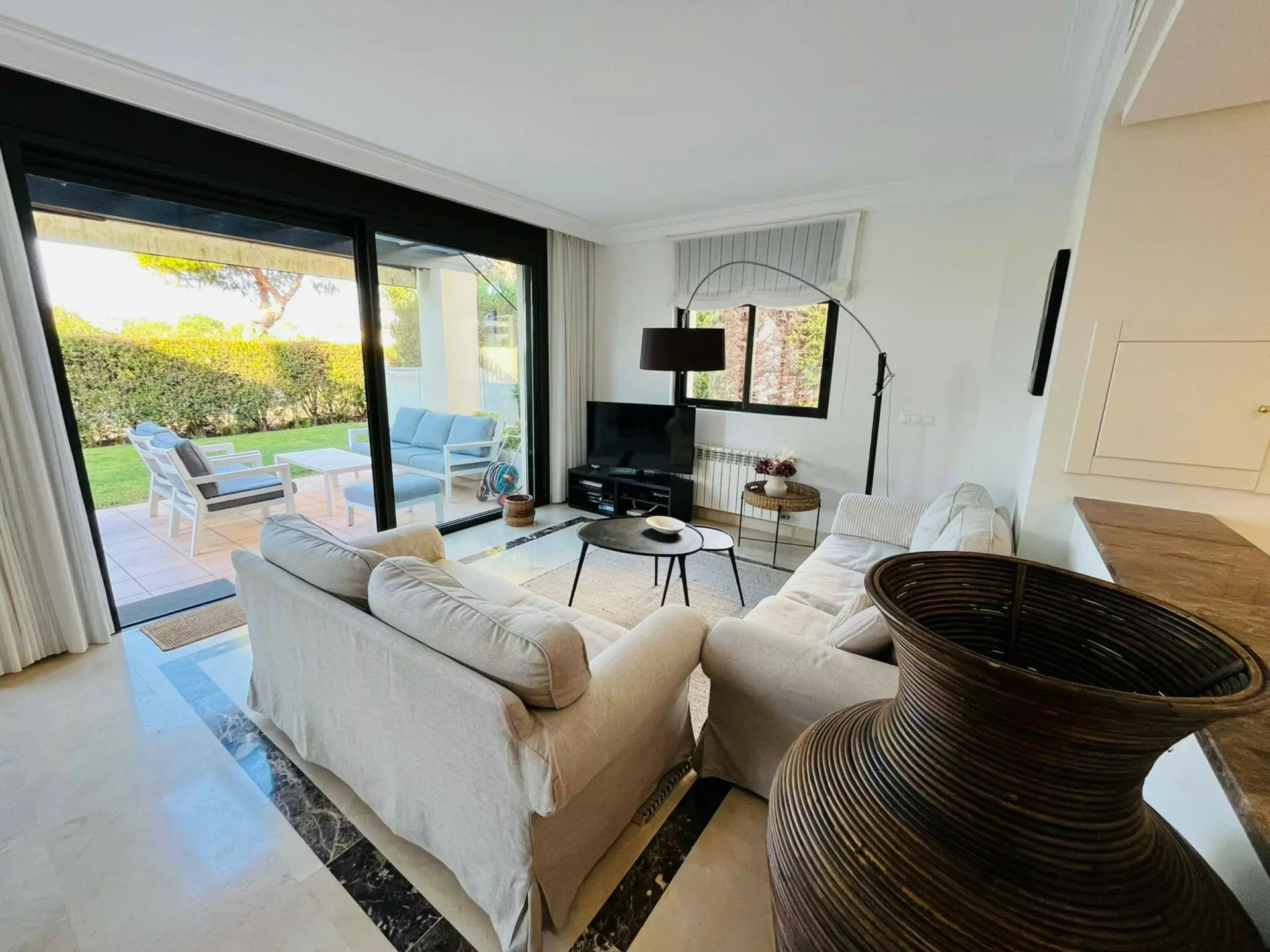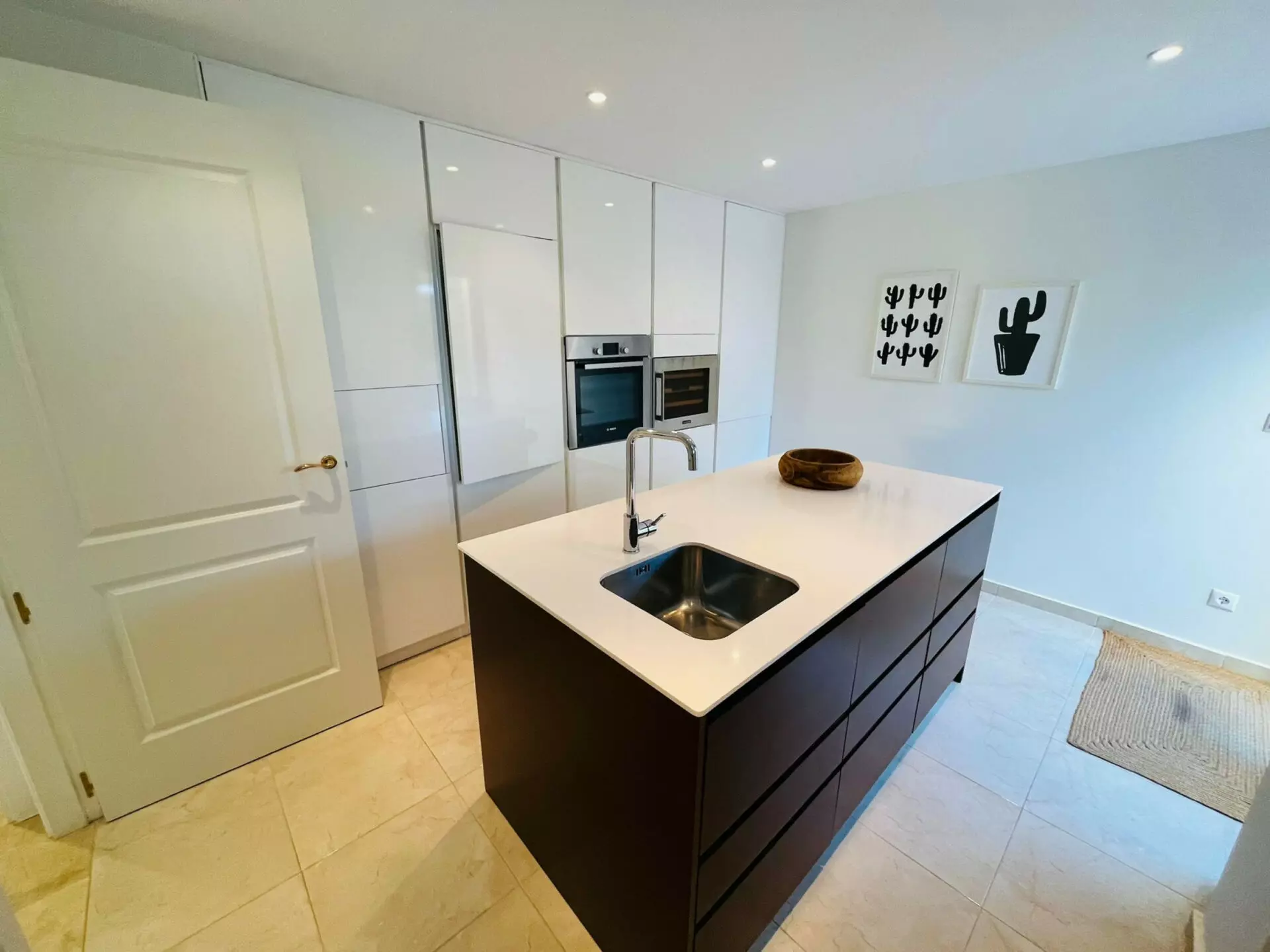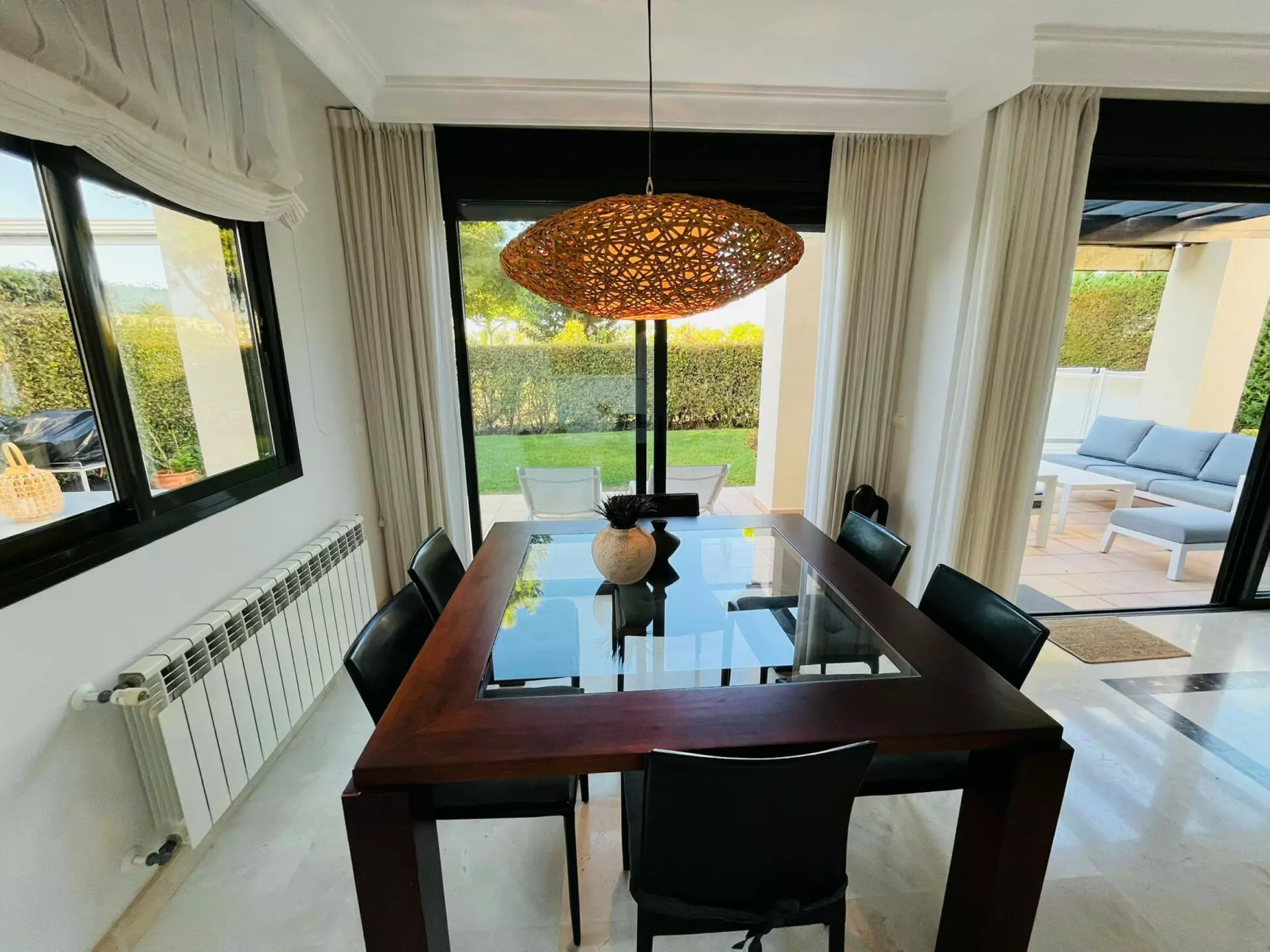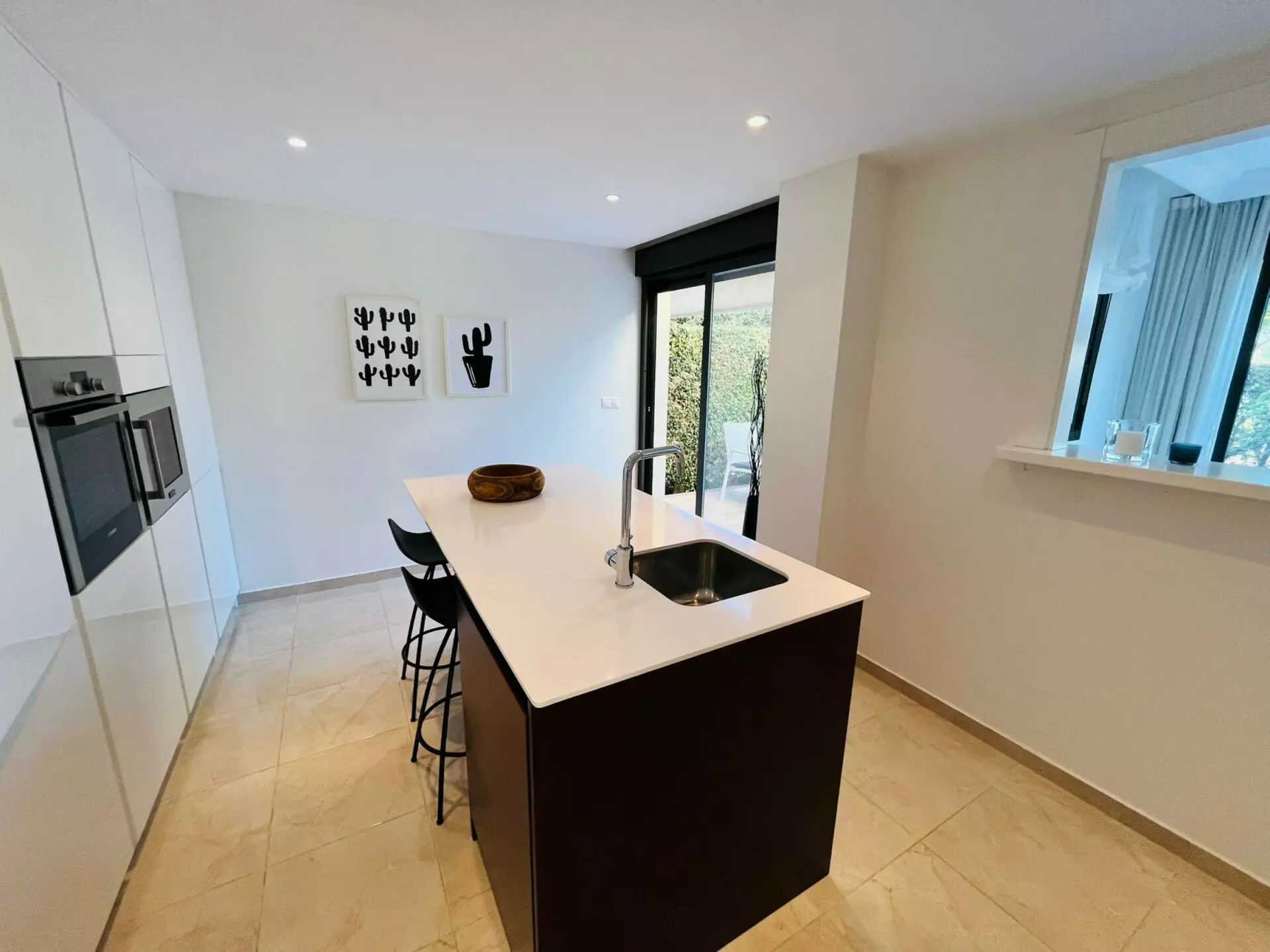 On the ground floor, you will find a bright lounge and dining area. The large glass sliding doors lead directly to the private garden and swimming pool area. This setup provides a suitable space for both relaxation and entertaining guests. The kitchen is modern and renovated, featuring a sleek white gloss design. It also has glass doors that open to a sun terrace, which can be utilized for outdoor dining. This level includes a guest toilet and a double bedroom for added convenience.