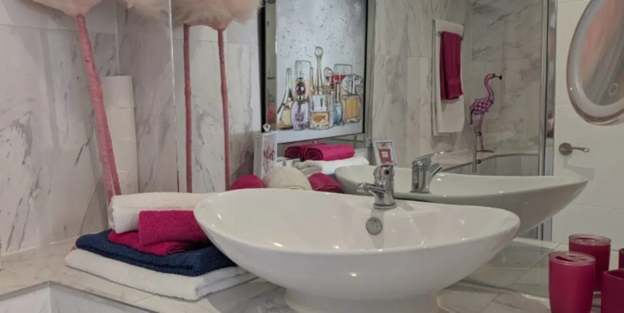 The garden has a pedestrian entrance gate as well as an electric vehicle gate leading out to a carport covered by a floating pergola. A 2.4-meter-high wall topped with frosted glass panels offers ample privacy. The plot itself is a tiled area that requires no maintenance and at the front of the villa, there is space to eat or play table tennis. There is also a sunny corner for sun loungers with a mature palm tree offering shade. An orange and lemon tree in two huge white ceramic pots gives a true Mediterranean atmosphere upon arrival. A covered porch protects access to the front door, while to your left is a storage cupboard. Next to this, a staircase descends to the stunning swimming pool. Fourteen meters long, with a jacuzzi area and a variety of multi-coloured LED lights for wonderful night effects. The pool is saltwater, with a state-of-the-art heating system for year-round swimming, an LED-lit waterfall, and a balloon at the far end. The surrounding tiled garden has space for sofas, sun loungers, and parasols, as well as statues and a variety of large potted plants. Again, a wall with tall frosted glass panels provides complete privacy. This is the perfect area for a quiet swim or to party the night away to the rhythm of the twinkling lights. At the far end of the pool and to the right is a barbecue area next to a covered seating area with a table and stone benches. To the rear is a large room which stores the pool heater, pool pumps, and jacuzzi and over 6 m2 of additional tiles matching those used inside and outside the property in case of future breakage.