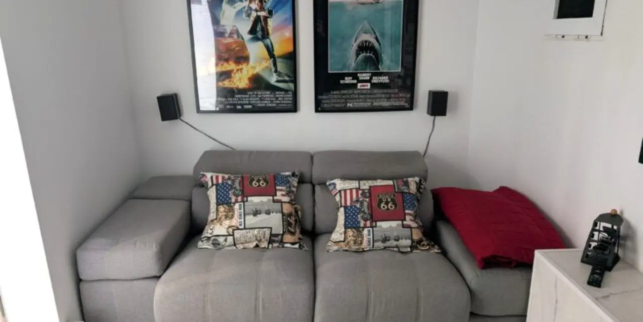 The Semi-Basement: Three sets of French sliding doors lead to adjoining areas of this air-conditioned “fun” part of the villa. To the left is a bar with leather cushions, along with table and chairs, bar stools, wine racks, a beer tap, and a wine fridge. To the right is a large rectangular space where the owners currently have a full-size pool table, foosball, electronic dartboard, and a sofa. At the rear left, there is a completely soundproofed cinema room. Buyers will have to provide their own TV and Dolby Atmos sound system, but the pull-out sofa, curtain, and director’s clapperboard remain. To the rear, there is a bathroom and another storage room, and to the right is a large bedroom with hot/cold air conditioning.