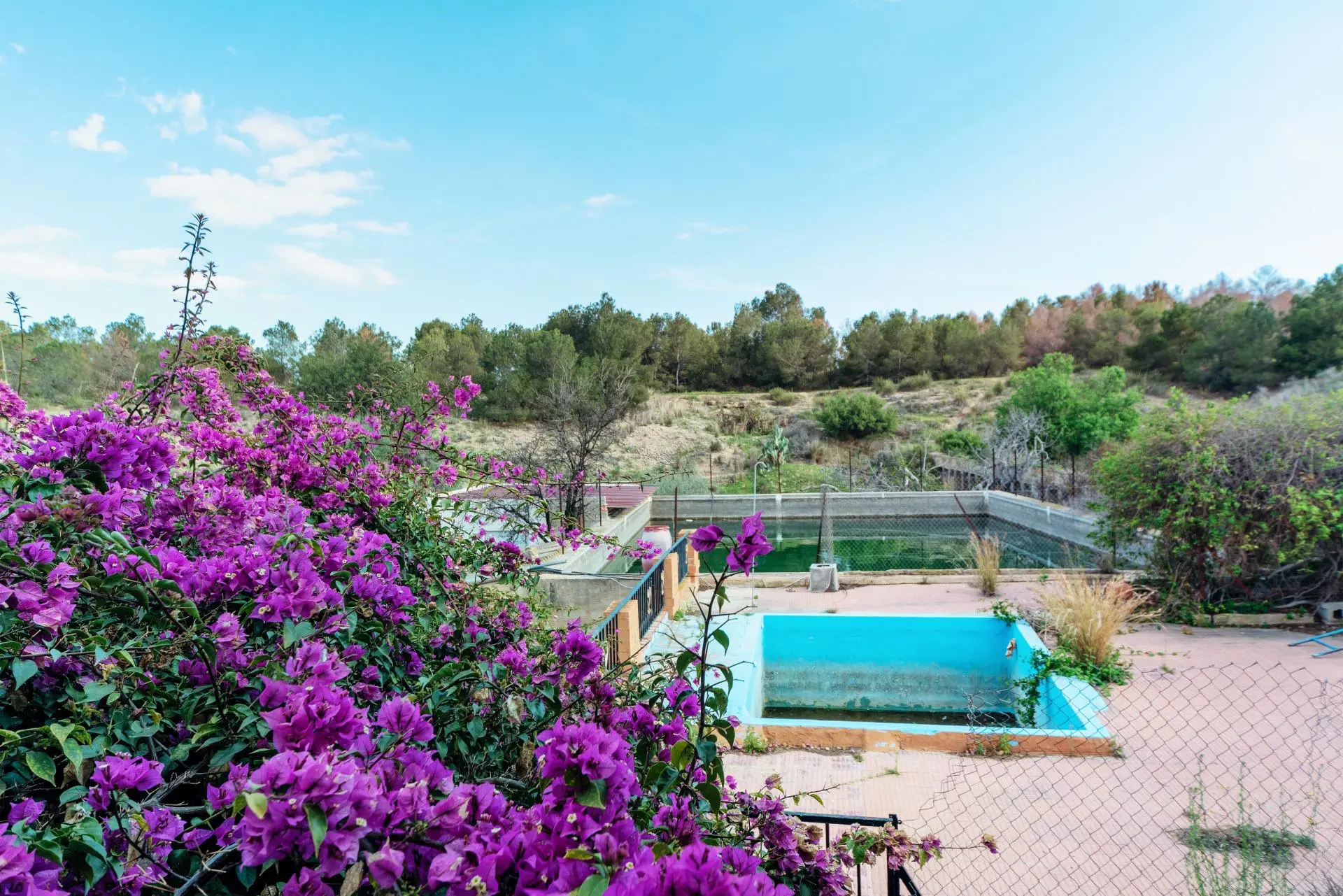 Next to the swimming pool, there is a reservoir that provides controlled and stable irrigation. The total land area is 11,000 square meters, which includes a large cultivation area. There is also a double garage, a built-in barbecue, and a rainwater well.