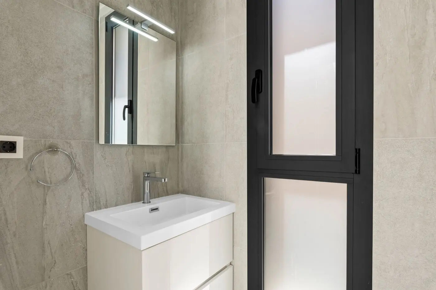 Level -1; Through a second (shared) porch is also the lower floor to reach. Also this floor has a living room with spacious open kitchen which is again equipped with all necessities. Also this floor is equipped with two bedrooms, one with en-suite bathroom, and the other with a spacious walk-in closet. Due to several daylight entrances, there is also more than enough natural light on this floor.