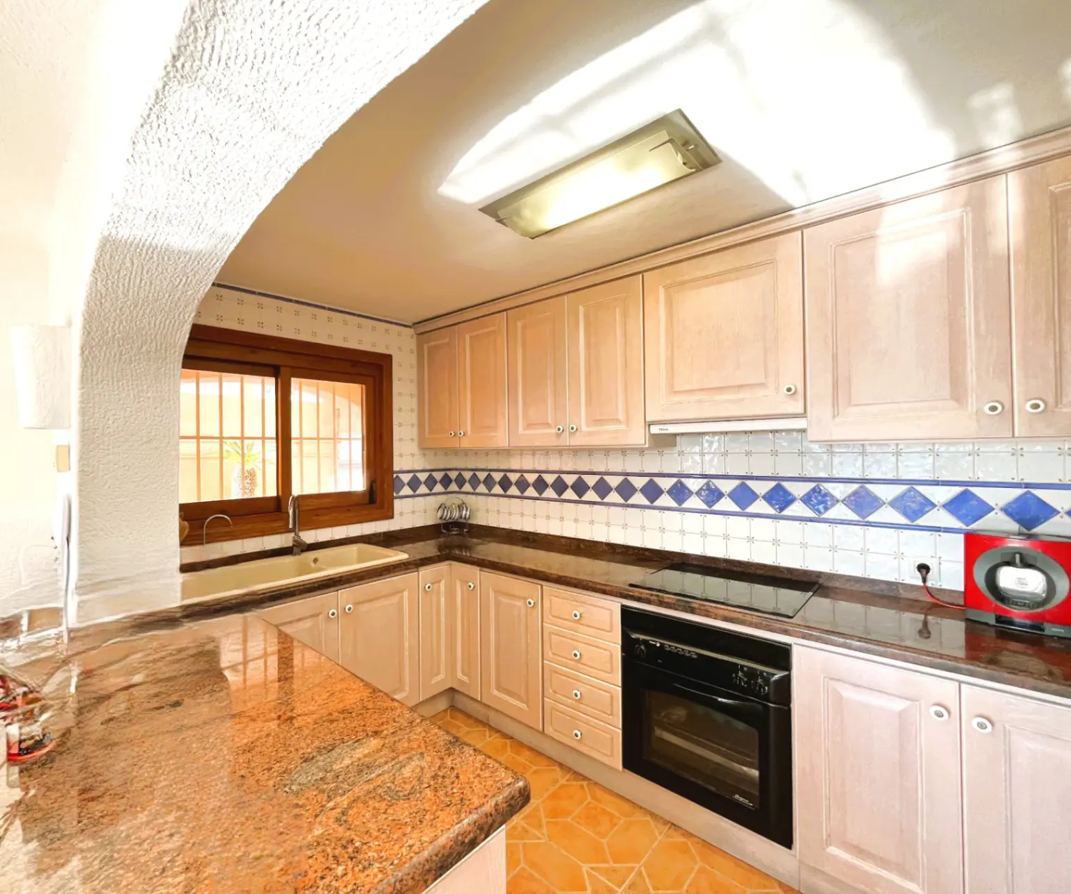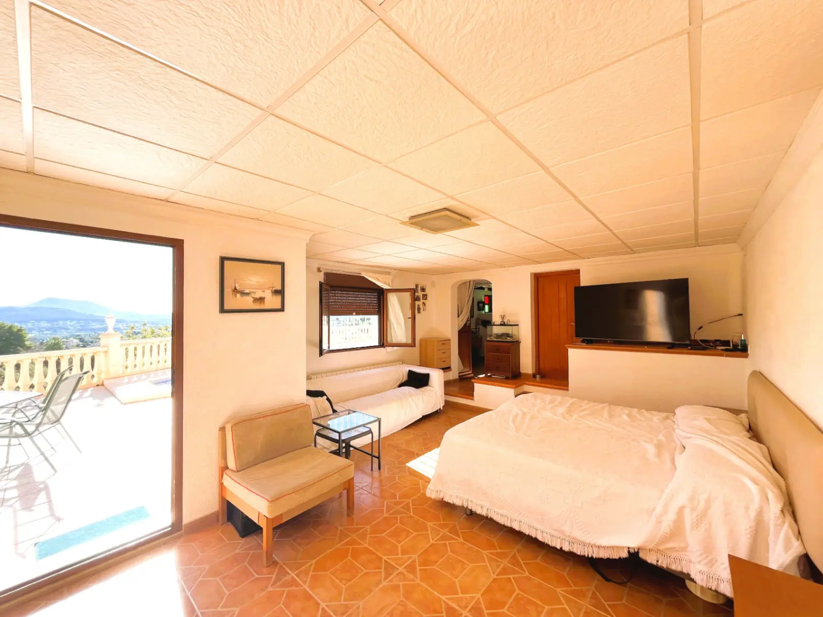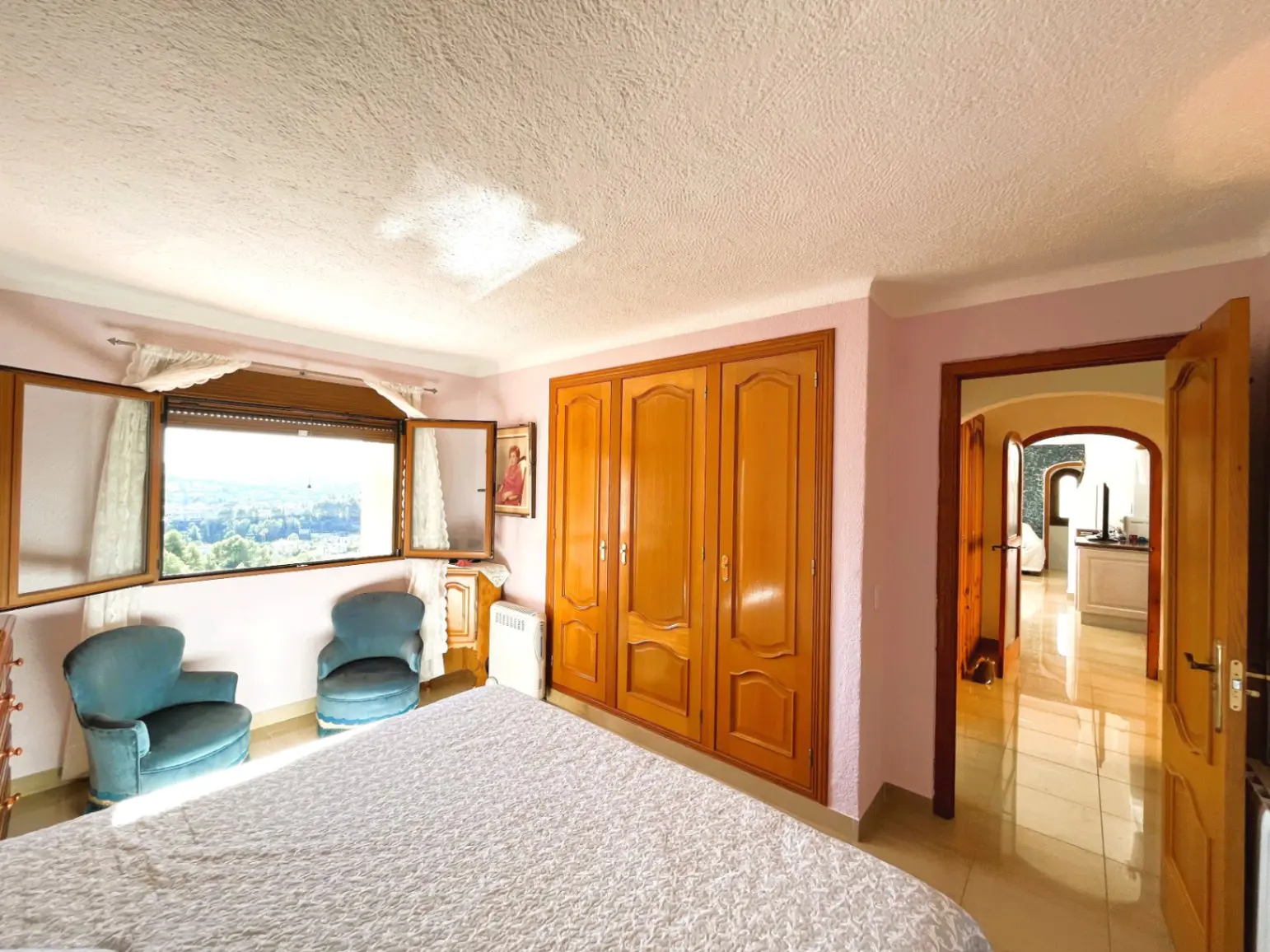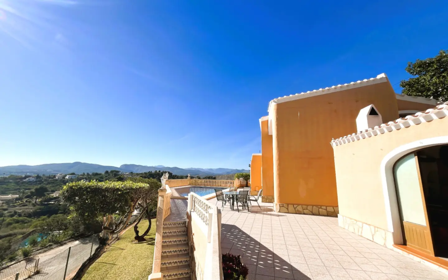 House located in the quiet and sought-after area of Montgó, this south-facing villa stands out for its magnificent open panoramic views and natural surroundings, ideal for those seeking peace, privacy, and quality of life. The exterior of the property offers a pleasant private pool area, accompanied by a fully equipped summer kitchen with barbecue and outdoor bathroom, perfect for enjoying the outdoors, family gatherings, or moments of relaxation under the sun. Additionally, the property features parking with a pergola for one car, providing comfort and protection. Inside, the main floor houses a bright living room with a fireplace, which adds warmth and comfort, connected to the dining room and an open kitchen that create a practical and cozy space. On this same floor, there are two bedrooms and a full bathroom. From here, there is access to a spacious terrace with clear views, ideal for resting and contemplating the landscape. The lower floor has a separate living room, an additional bedroom, and a bathroom with a shower, offering a versatile space perfect for guests, a rest area, or private space, with access to the pool terrace. The property is equipped with central heating via radiators using propane bottles, ensuring comfort all year round. Thanks to its south orientation, it enjoys abundant natural light throughout the day, creating a pleasant sense of well-being in every season. A property that combines privacy, tranquility, and exceptional views in a privileged setting.