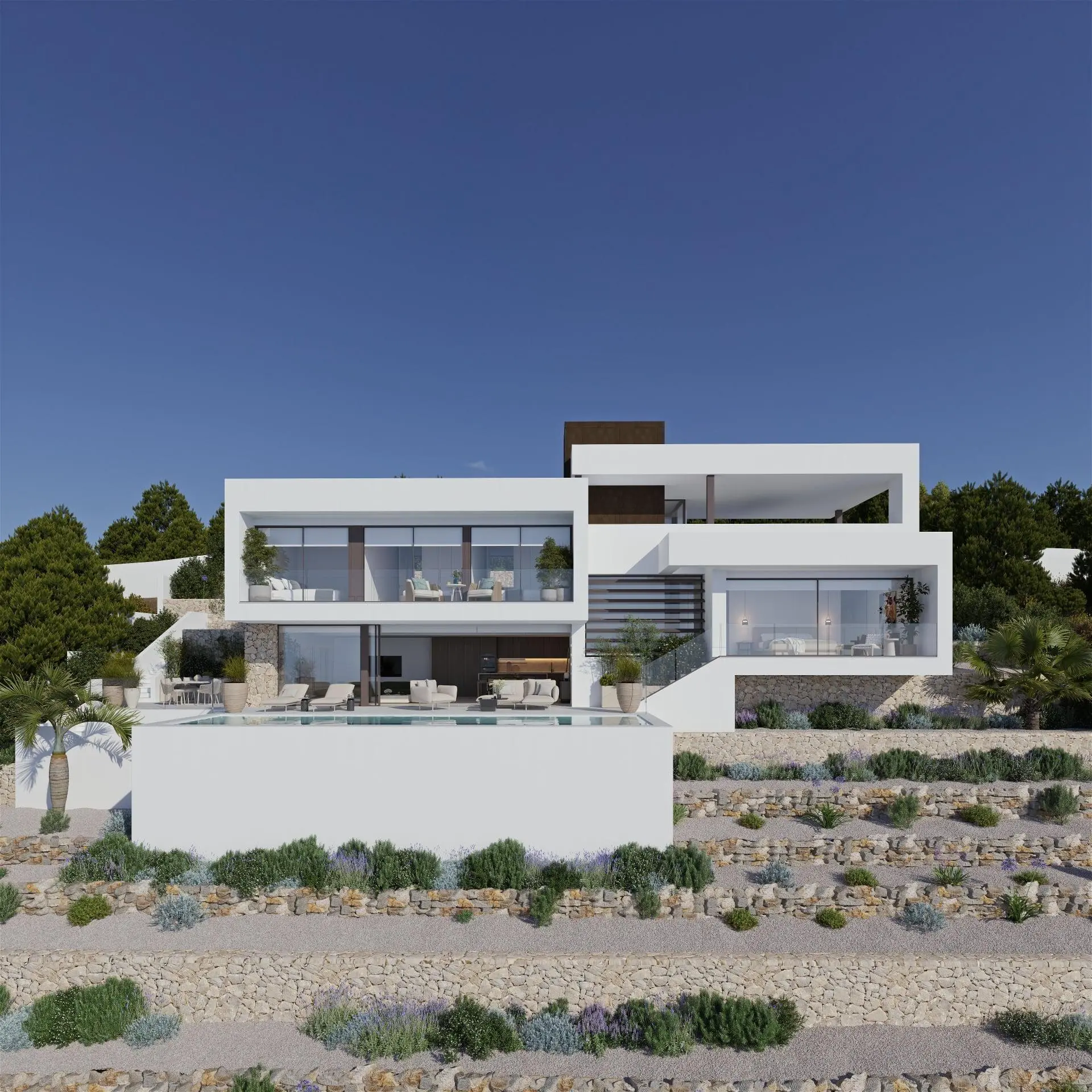 The villa is spread over two floors and includes four bedrooms, each with an en-suite bathroom. It features a large living-dining area with an open kitchen, and there is a main terrace equipped with an infinity pool that merges seamlessly with the horizon. All main rooms are oriented towards the sea and provide direct access to the outdoor spaces.