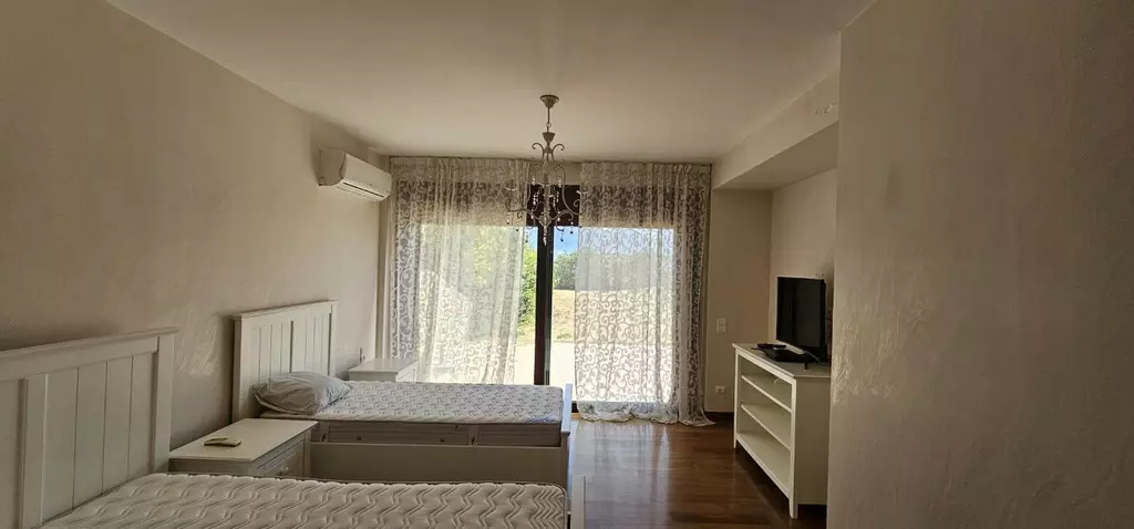This villa offers a view of the sea and surrounding mountains from its windows, enhancing the overall living experience. The property is equipped with various amenities including air conditioning for climate control and awnings for outdoor coverage. Additionally, there is a designated barbecue area, perfect for outdoor cooking and entertaining.