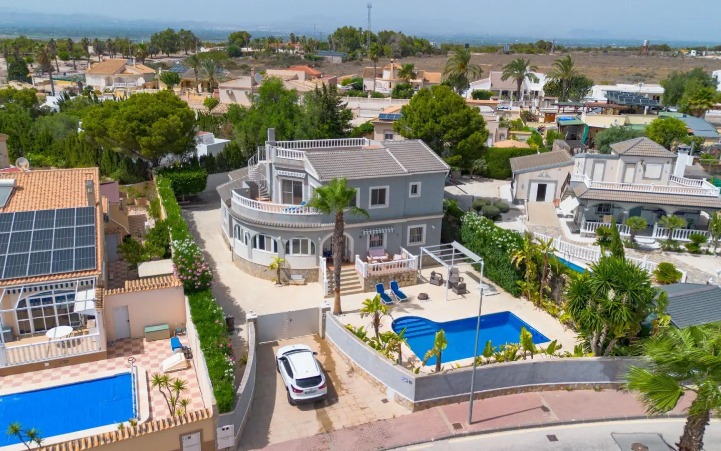 We present a detached villa located on a private plot of 885 m2, situated in the La Marina area of San Fulgencio. The property offers 5 bedrooms and 5 bathrooms, including an outdoor bathroom that can be used as a pool bathroom or for guests. The layout makes the property suitable both for a large family and as a holiday home. The interior features a spacious and bright living room with a fireplace, a dining area, a fully equipped kitchen, and a glazed patio that can be enjoyed all year round. Additionally, there is a laundry room and a utility room. The property also includes a terrace and a private solarium, providing ideal space for relaxation and sunbathing. Outside, the property offers a private swimming pool, a well-maintained garden, and a closed garage with space for two cars. The property provides ample space, privacy, and comfort, while offering convenient access to local services and infrastructure. Contact us to arrange a viewing of the property.