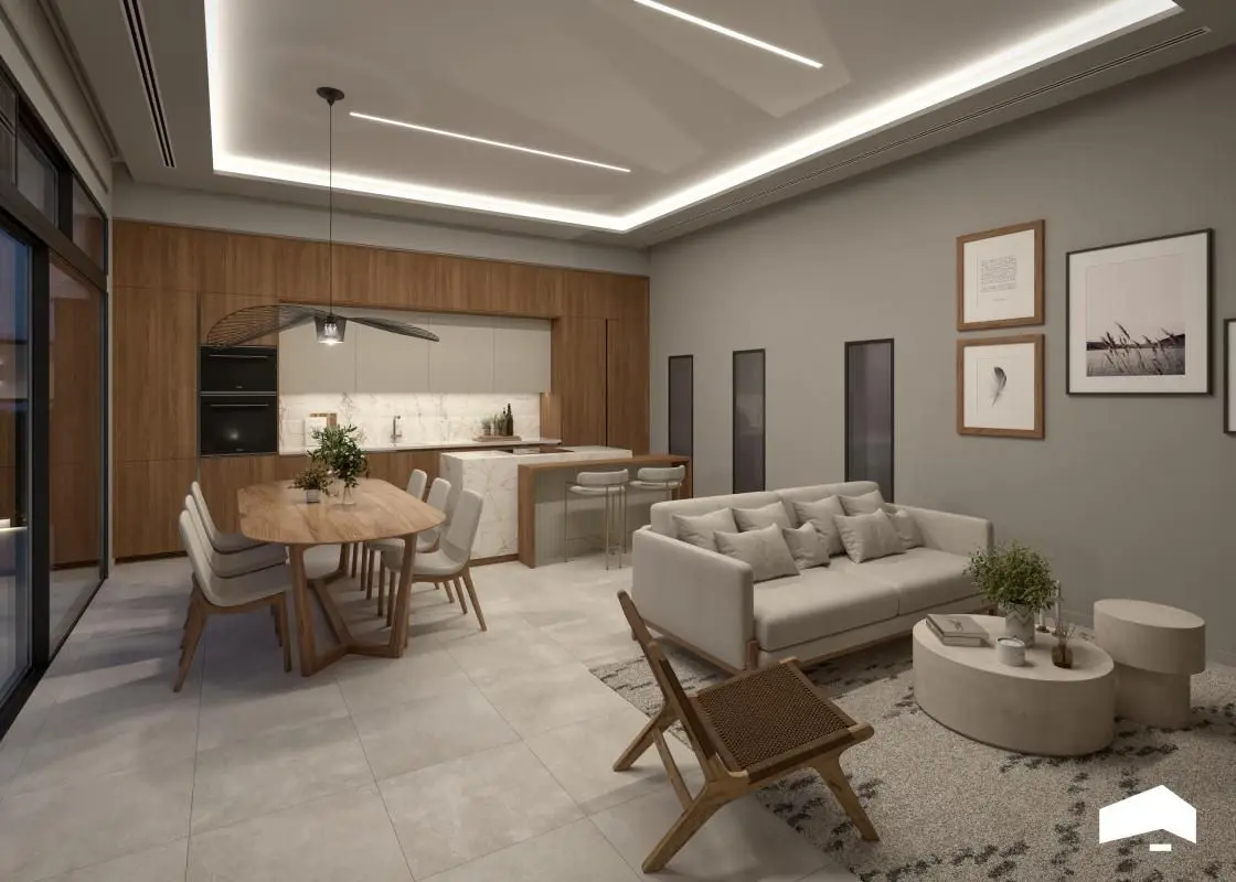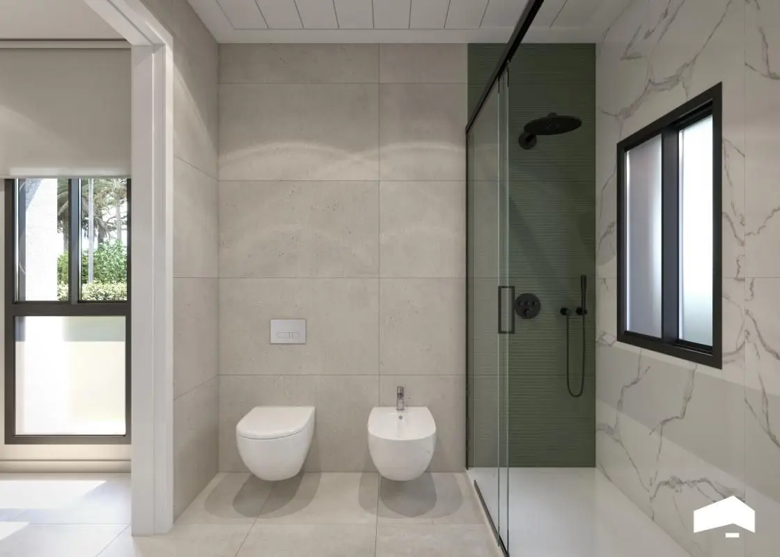 These homes are thoughtfully designed with modern aesthetics and are spread across two floors. Each villa features three bedrooms, two full bathrooms, and an additional half-bathroom. The open-plan layout seamlessly combines a fully equipped kitchen with a living-dining area, creating a bright and well-lit atmosphere. Every villa is equipped with built-in wardrobes, a private garden with a pool, on-site parking, and a private solarium.
